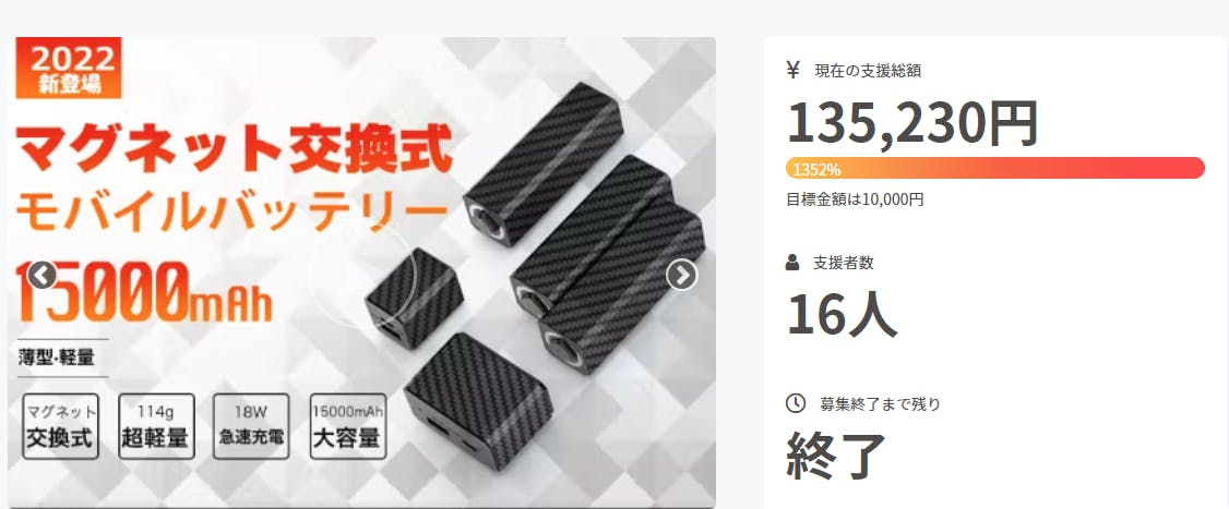 2022/11/25 12:09ご支援者の皆様この度はたくさんのご支援をいただき誠にありがとうございました。11月4日にプロジェクトを開始し、約三週間と短い期間でしたが、本日プロジェクトを終了いたしました。応援購入総額 135,230 円サポーター 16人皆様の応援のおかげで、当初の予定より大きく上回り、プロジェクトを達成する事ができました。MakuakeやSNSを通して皆さまから直接共感の声を沢山いただき、とても大きな励みとなっております。1日でも早く皆様のお手元にお届けできるよう準備をしております。こちらで進捗をお伝えしていきますので今暫くお待ちいただけますと幸いです。改めましてすべての皆さまへ心より御礼申し上げます。株式会社Create Betterマグネット交換式モバイルバッテリー制作スタッフ一同 もっと見る