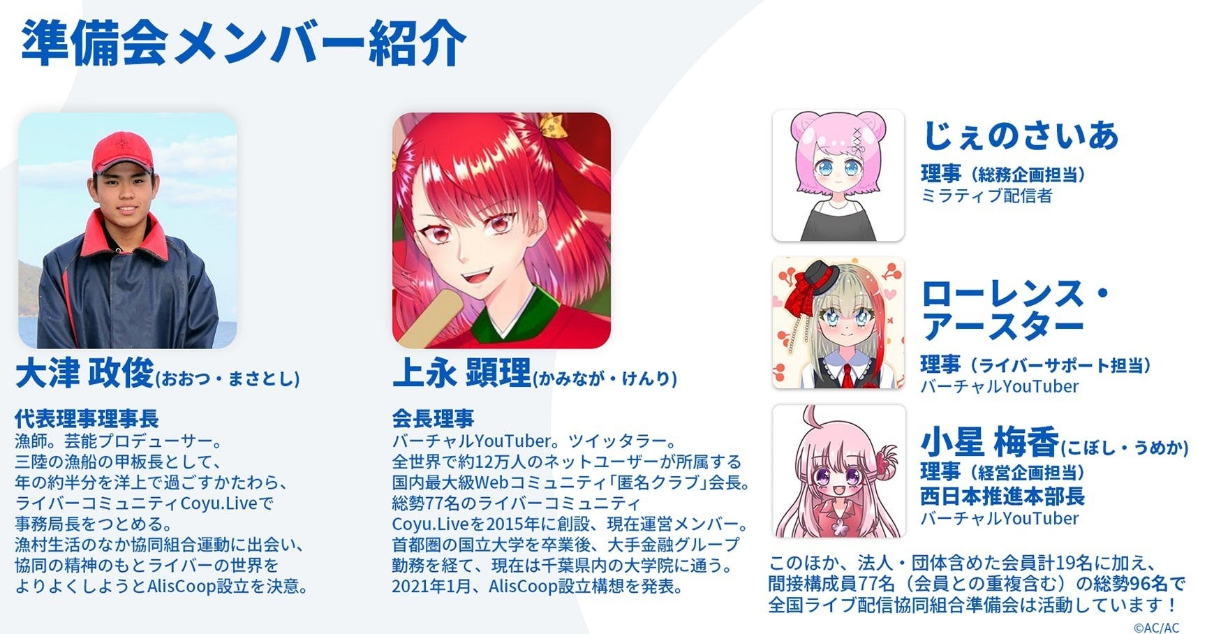 これらの課題を打開するには、個人ライバー、事務所所属の「企業勢」を問わず、本気で挑むすべてのライバーが結集し、ライバーという職業をもっと安心できるものに変えていく必要があると考え、「全国ライブ配信協同組合」(仮称。当会と組合を総称して「AlisCoop」といいます)の設立を決意するに至りました。