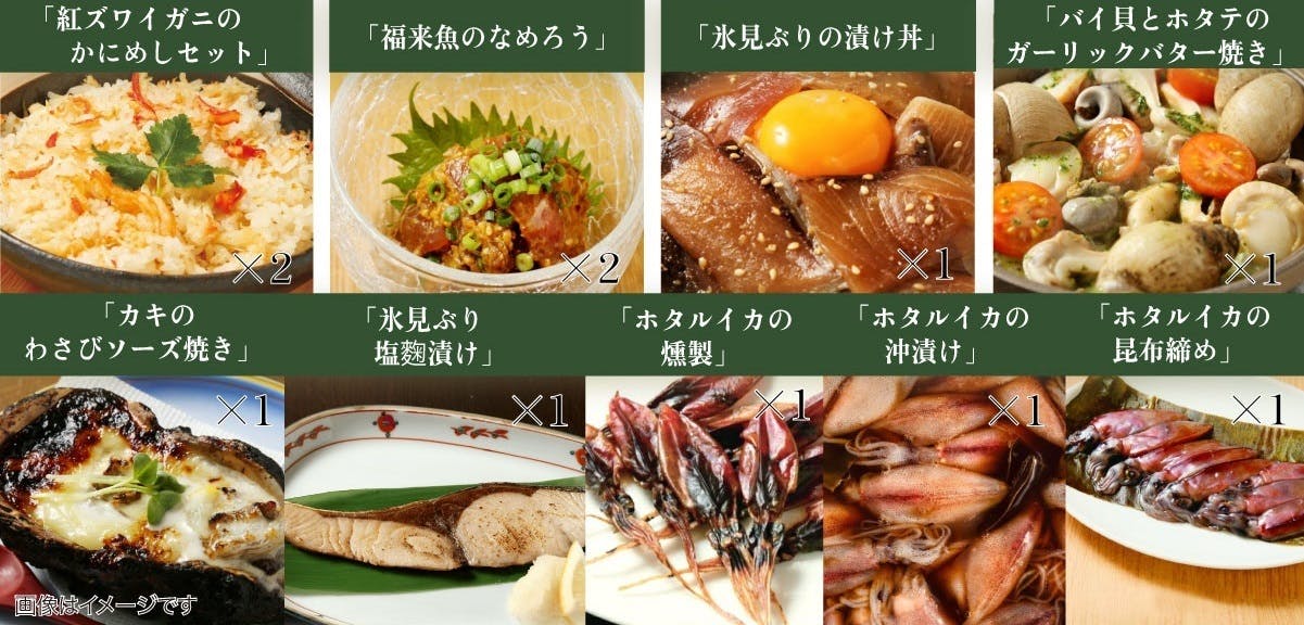ミシュラン2つ星を獲得した人気料亭による紅ズワイガニのかにめしセット、さまざまな銘店の味が一度に味わえる海鮮食べ尽くしセットなど、地元のうまいもんを食べ尽くした私たちならではのラインナップ。