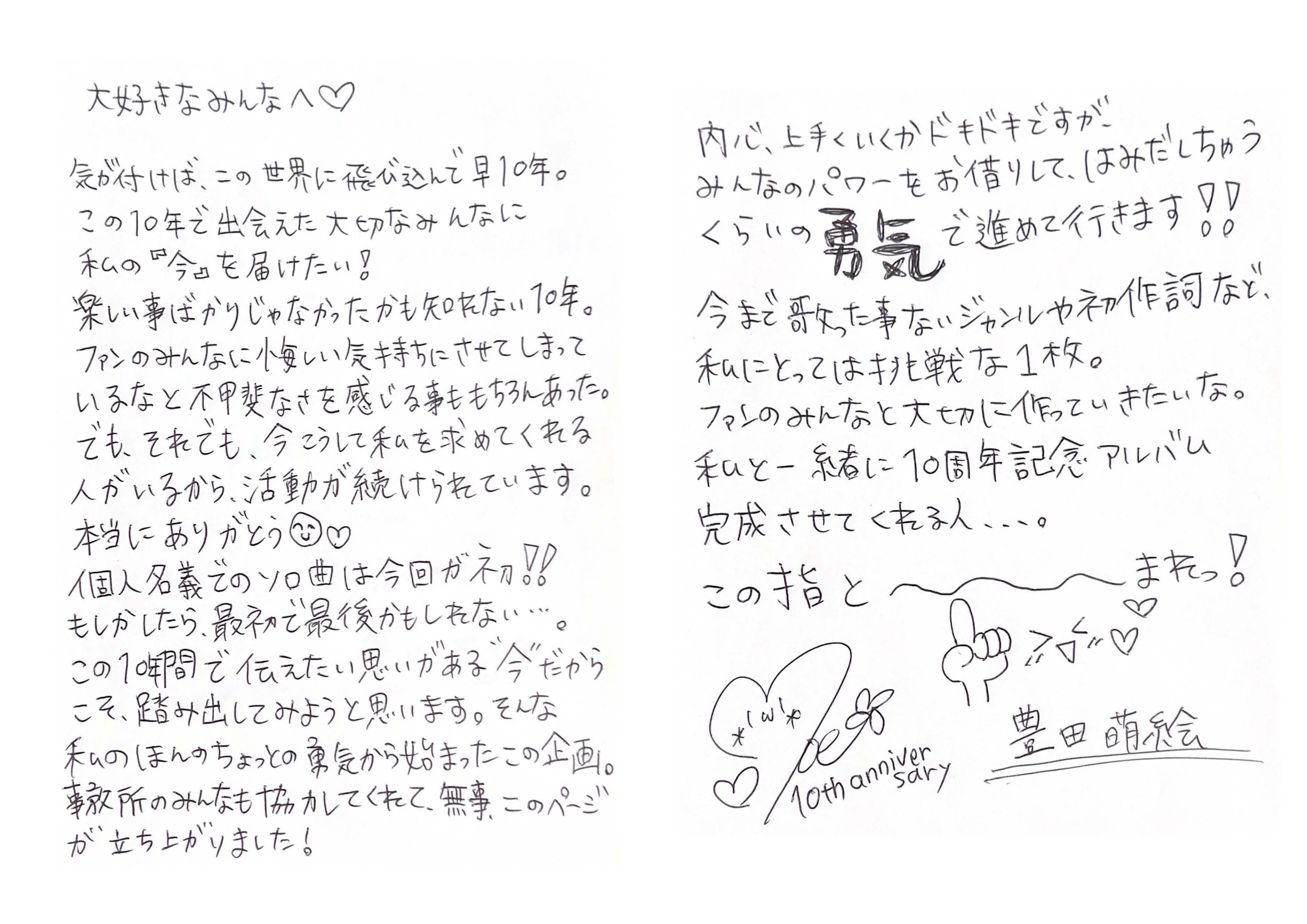 豊田萌絵の声優活動10年分の写真を散りばめた記念フォトブック(32P以上を想定)になります。