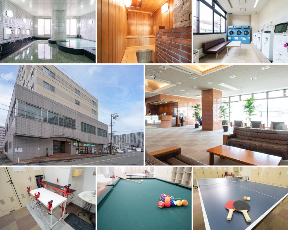 館内は温泉大浴場にコインランドリー、ビリヤードや卓球が楽しめる共有スペースがあります。建物1階にはファミリーマートも入っていますので、宿泊者にとっても優しい民泊施設です。