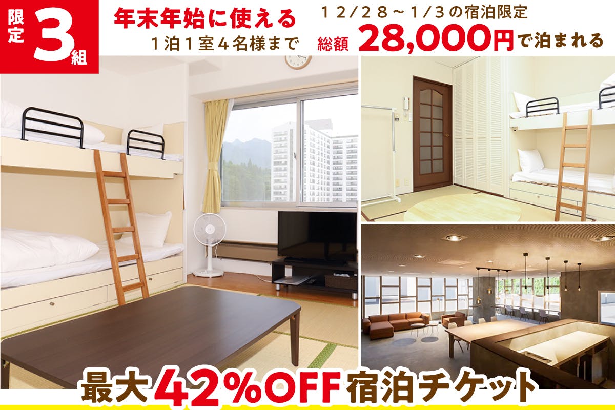 スキーシーズンに使える◎1泊1室7名様まで総額20,000円で泊まれる最大50%OFF宿泊チケット
