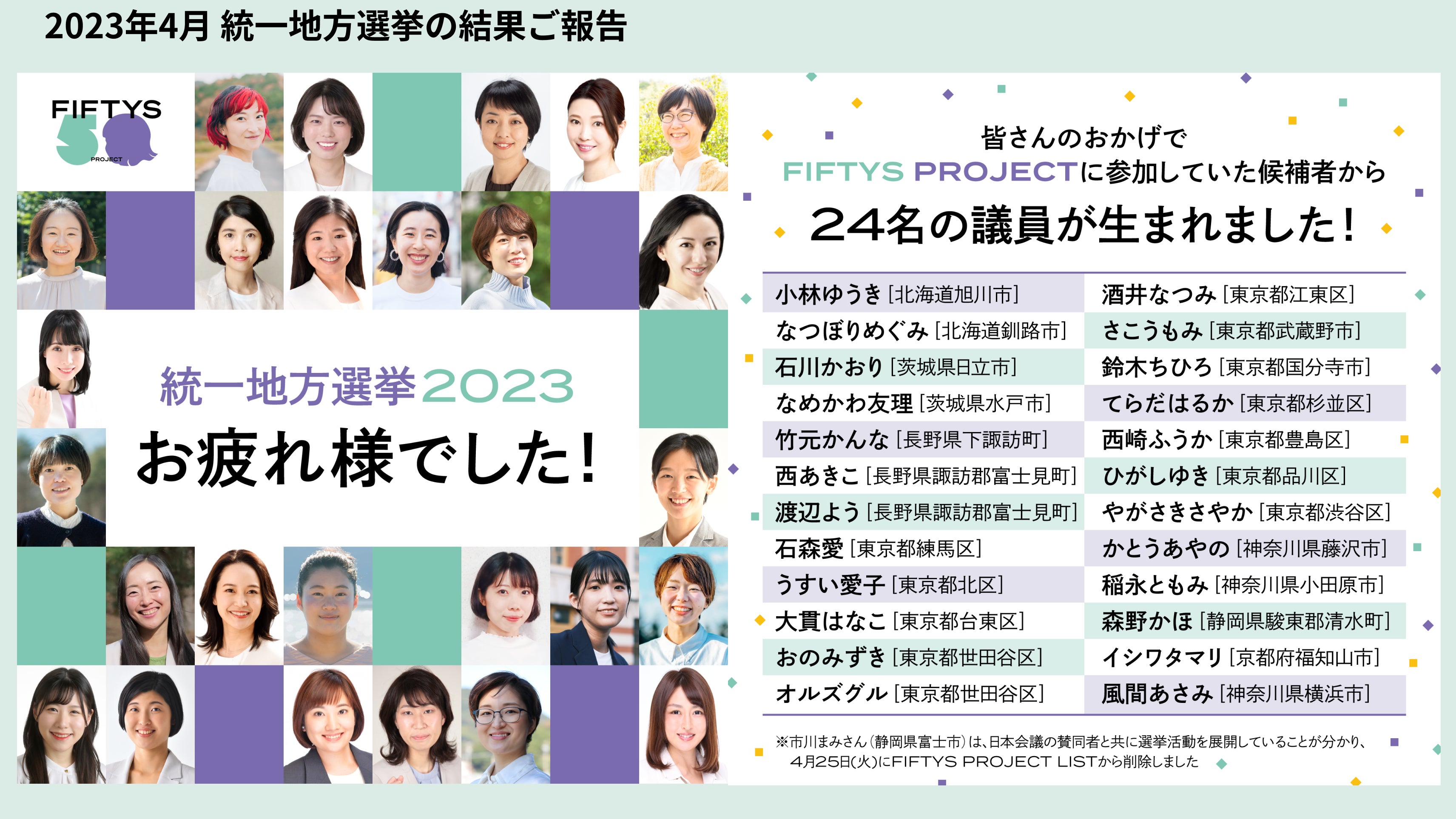 結果として、統一地方選挙ではFIFTYS PROJECTとして29名の候補者を支援し、24名の女性議員が誕生しました。