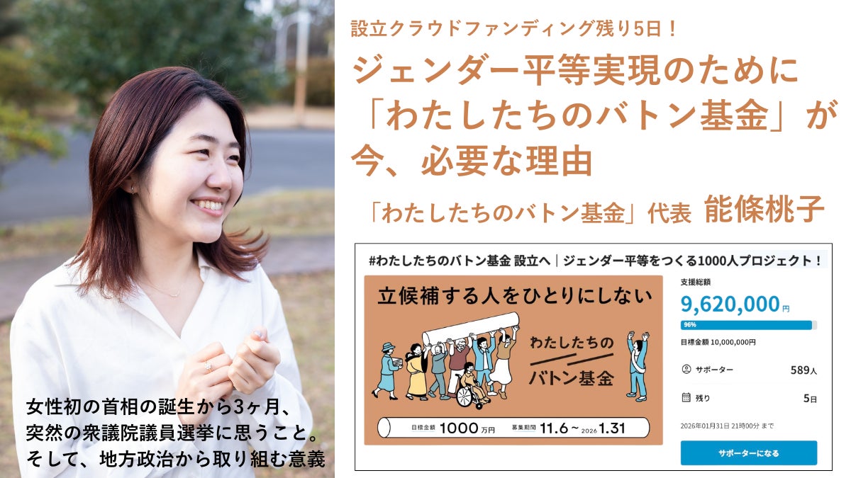 2026/01/26 19:18「わたしたちのバトン基金」クラウドファンディング実施中!(1月31日まで)https://congrant.com/project/batonkikin/18700?spt_route=4a9ux92Jcy6FoRBT こんにちは、能條桃子です。2022年にFIFTYS PROJECTを立ち上げ、ジェンダー平等のために20代・30代の女性、ノンバイナリー、Xジェンダーの地方議会への立候補を呼びかけ、支援する活動をしてきました。 そして昨年11月、2027年4月の統一地方選挙に向けて、ジェンダー平等実現にコミットする20代・30代の女性、ノンバイナリーの候補者1人につき30万円(供託金として選挙に立候補するために用意しなければならない資金)の支援を行う「わたしたちのバトン基金」の設立を発表しました。現在、最初の30人分の支援金を集めるためのクラウドファンディング(目標金額1000万円)を行っており、残り5日となりました。▼クラウドファンディングページhttps://congrant.com/project/batonkikin/18700?spt_route=4a9ux92Jcy6FoRBT「わたしたちのバトン基金」クラウドファンディング残り5日 達成率96% 各地域で「立候補しようかな」と迷っている素敵な人たちがいることをFIFTYS PROJECTで候補者を増やすための土壌づくりの活動している私は知っているけれど、候補者の公募を開始する4月の前の段階で、まだ候補者の顔が1人も見えない状況。そのような中で、私たちを信じて、私たちの希望を託せる政治家を増やす後押しをしてほしい、という呼びかけをどれくらいの人が理解してくださるのか、予想ができない不安な中でのクラウドファンディングの呼びかけでした。 発表から2ヶ月半が経ち、ありがたいことにこれまで588人の方があわせて9,615,000円支援してくださっています。「今の日本に必要な活動、自分も参加したい」「自分は立候補はできないからこそ、支える側に一緒にまわりたい」など温かい声をいただき、心強く感じるとともにその期待に応える活動をしていきたいと背筋が伸びる思いでいます。改めて、ここまで支援してくださった皆さま、本当にありがとうございます。急な衆議院選挙について思うこと ずっと日本で生まれ育った私にとって政治の景色が中高年男性に占められているのは当たり前のこと。選挙はするけれどいつも同じ世襲議員が当選することも、期数を重ねた政治家がより力を握ることも、政治とはそういうものだと思っていました。大学生の時にデンマークに留学し、女性議員が4割存在し、首相が女性であるということが人気の理由にすらならない社会を見て、初めて日本を外から見て日本の政治の場の異常さを認識し、今とは違う景色を見たいと考えるようになりました。そして今、FIFTYS PROJECT、わたしたちのバトン基金をつくり、その一歩を歩んでいるように思います。 そしてそんな中、急に衆議院議員選挙が行われることになりました。昨年の高市政権発足以降、伝統的な家族観や夫婦の絆を重視する「保守的な家族主義」の立場を明確にすることで保守勢力のなかでの支持を得てきた「日本初の女性の総理大臣」の誕生という出来事を前に、女性の政治家を増やすことだけではジェンダー平等政策が推進することがないという現実を改めて直視し、何をしなければならないのか考えながら目の前のやるべきことに集中する時間を過ごしてきました。 今回の選挙は、解散から投開票まで16日間で戦後最短とのことですが、2021年衆院選が17日間、2024年が18日間と、この直近の3回の衆院選が最短記録TOP3となっています。政権都合の解散、その中で準備する側・投票する側の視点を欠いた決定が続いていることは、いかに国政が国民目線とかけ離れてしまっているのか表しているのではないでしょうか。 「普通の人たち」の人生を想像できる候補者はどれくらいいるだろう。「普通」の想定に当てはまらないことがある人のために働く意思がある候補者はどれだけいるだろう。誰のための、何のための選挙なのか、疑問に思いながら、図らずもクラウドファンディング中にはじまることになった選挙を眺めています。足元の地方政治から取り組む意義 2022年にFIFTYS PROJECTを立ち上げた時、国政に振り回されず、足元の地域の政治から変えていくことを目指して「地方議会」にフォーカスすると決めました。もちろん国政も重要ですが、自分たちの手からあまりに遠いところで行われる様々なことに、無力感を学習してしまっているなかで、自分の住むまちのことだからこそ身近に感じられること、変えられること、イデオロギーだけでなく「必要なこと」に根差した対話ができるのではないか、と考えていました。 2023年4月の統一地方選挙では、FIFTYS PROJECTに参加して29名が立候補、24名が当選。そこで当選した議員の方々は各地方議会でジェンダー平等に向けて様々な取り組みをしています。保育士や介護士の処遇を上げるために、役所での女性管理職を増やすために、災害が起きた時に少しでも問題が減るように、生理用品のアクセスを向上するために、子育てを母親がひとりで背負わずに済むよう