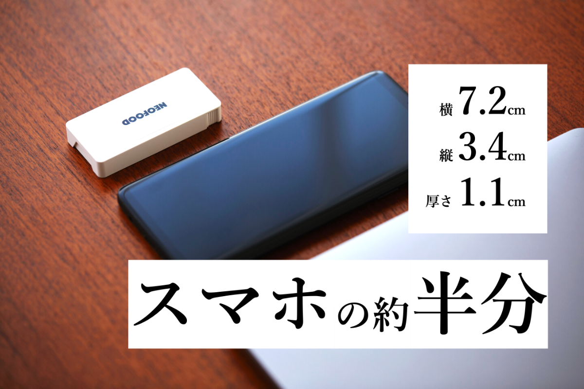 携帯性を実現するために、手のひらに収まる名刺サイズであり、ポケットに入れても膨らまず不自然にならない薄さを追求しました。一見すると小さければ小さいほど良いように思えますが、小さすぎると逆に落としてしまったり隙間に入ってしまったりと紛失する可能性があるので、ちょうど日常で見慣れていて邪魔にならないサイズ感になっています。スーツの胸ポケットに入れたり、ズボンのポケットに入れたり、デスクの横に置いても全く不自然ではありません。また「18g」と超軽量なので、持ち運びにも最適で、歩きにくさも感じさせません。