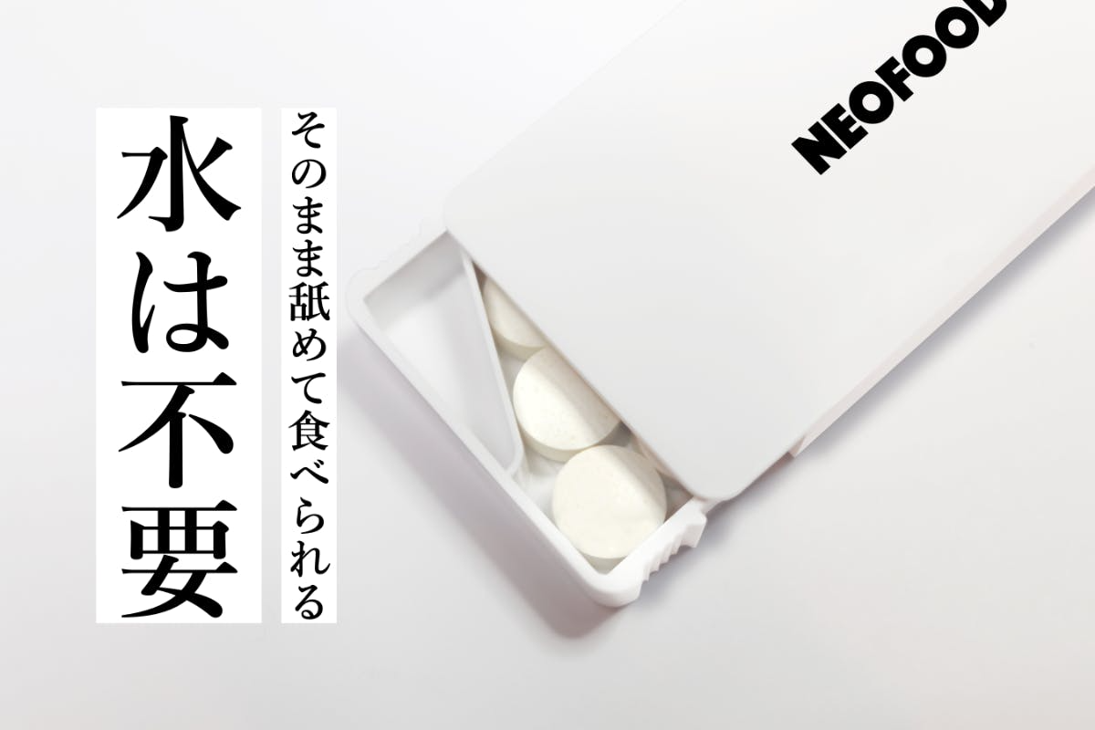 錠菓子(ラムネ)の形式をとっているため、サプリのように水で流し混む必要はありません。唾液のみで舐めて食べられます。日常生活においては飲み物を手にとっている時間は限られており、水分は重いので携帯にも不向きです。またパンや麺だと携帯することは難しい上に、移動中やデスクで食べてると目立ってしまい、仕事中はマナー違反になる可能性もあります。
