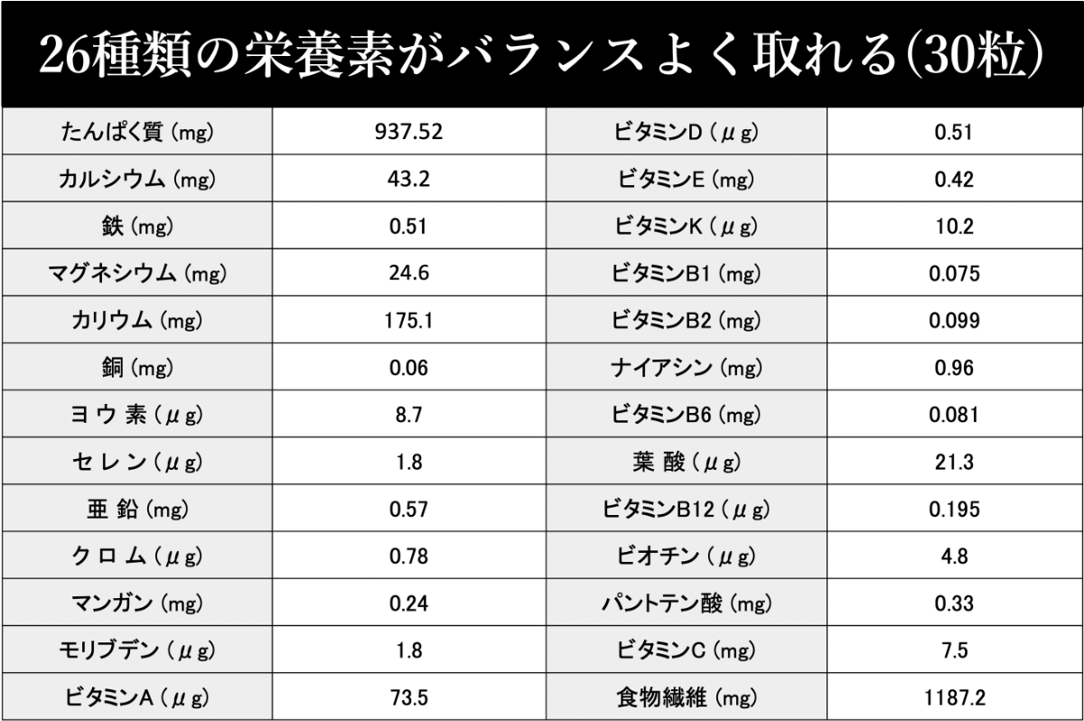 厚生労働省の定める「日本人の食事摂取基準」に基づき、人間が生きる上で必要な26種類の栄養素がバランス良く摂取できるように設計しています。ビタミン・たんぱく質・亜鉛など身体に必要な栄養素が詰まっています。