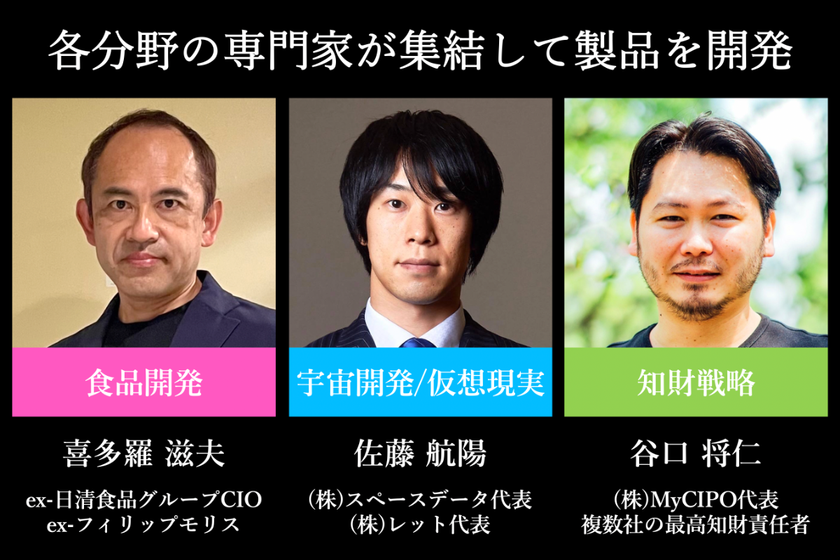 食品開発・宇宙開発・仮想現実・インターネット・特許戦略など本アイディアを実現するために必要な専門知識を持つプロフェッショナルが集結してプロジェクトを進めています。