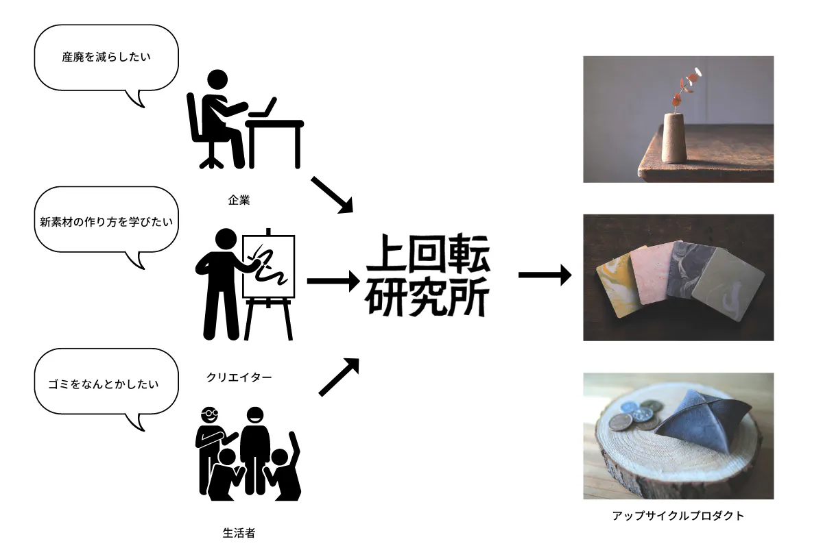 現在は既存のビジネスに捉われない株式会社On-Coの上回転研究所の所長として、アップサイクルの考え方や可能性を感じてもらい、社会課題を「自分ごと化」するきっかけづくりを目指して活動しています。