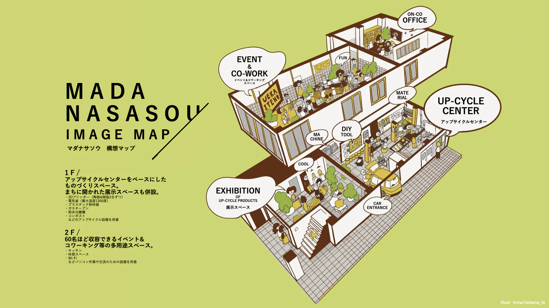 今回集まった資金は、1階を廃棄課題に向き合うアップサイクルセンター、2階をコワークする場にして、「まだなさそう」に向き合う・生み出す人たちが集まるイノベーション拠点として展開したいと考えております。