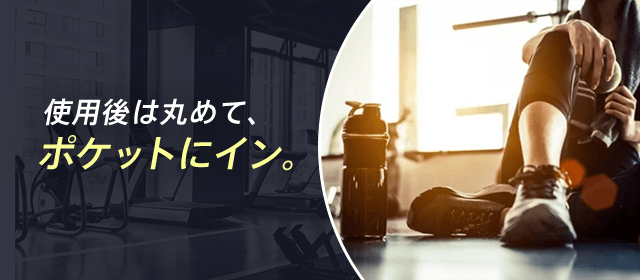 【GYMBUTLER】は伸縮自在のシリコンゴム製なので、使用後は丸めてズボンのポケットにイン。