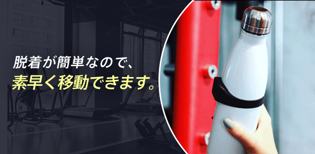 もちろんホルダーを付けたまま水分補給ができ、サーキットトレーニングなどトレーニングマシンを渡り歩く時も脱着が簡単なので素早く移動できます。