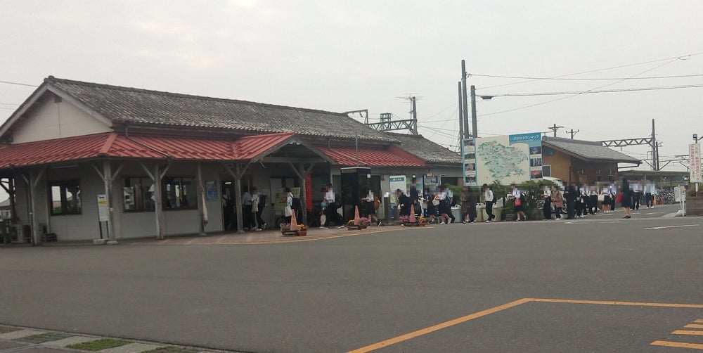揖斐駅の改札前 学生の長い列が続きます。