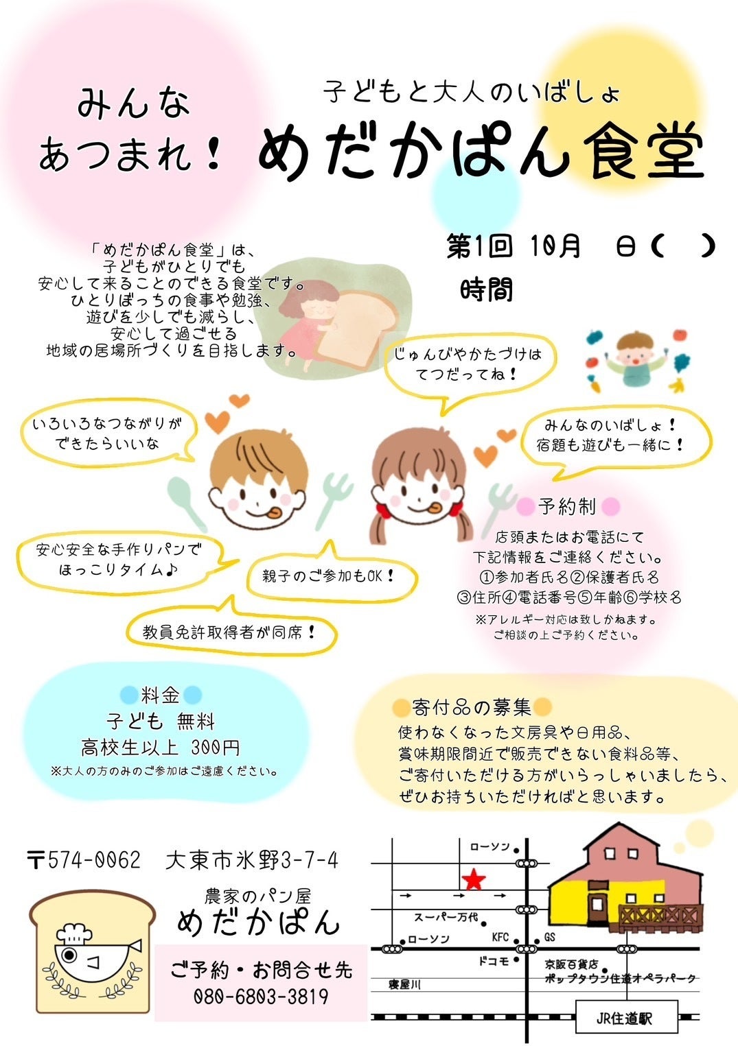 「めだかぱん」のある大東市氷野地区は前者のほどよく都会な場所に位置し、近くに氷野保育園、南郷保育所、氷野小学校、南郷小学校、南郷中学校などの学校が多く、たくさんの子どもたちが暮らしています。また、門真市や東大阪市にも近く、子ども食堂では広範囲の方に利用していただけると考えられます。