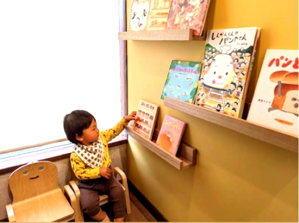また、狭い店内ではありますが、窓際に小さな椅子と絵本を並べています。お子様が自ら椅子に座り絵本を読んでいる間に保護者の方がパンをゆっくり選べるようになっています。