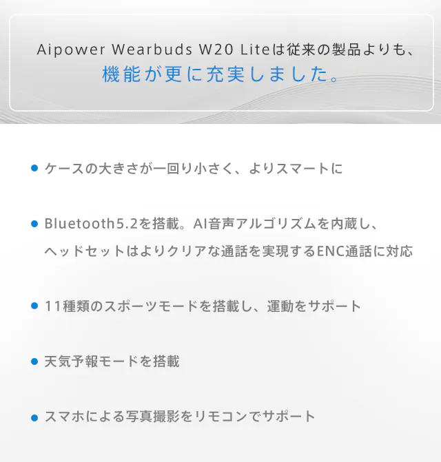 【Aipower Wearbuds W20 Lite】は音楽やスポーツ以外にも、スマホと連動させることであなたの生活を快適にし、健康をサポートする機能を多数搭載しています。