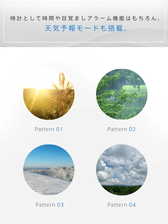 時計として時間や目覚ましアラーム機能はもちろん、天気予報モードも搭載。