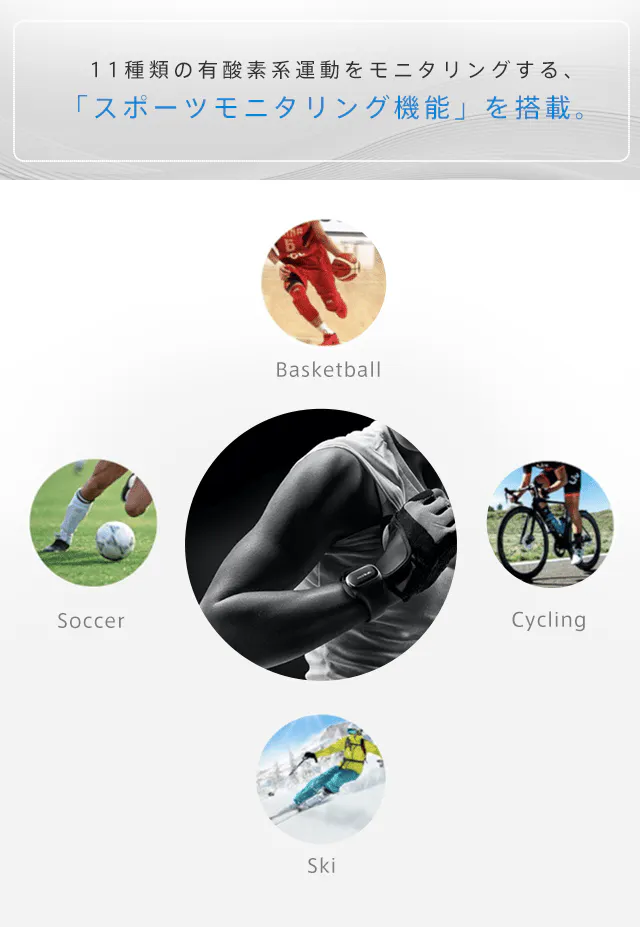 11種のスポーツに対応したモニタリングモードなど、多彩な機能であなたの生活をトータルでサポート。