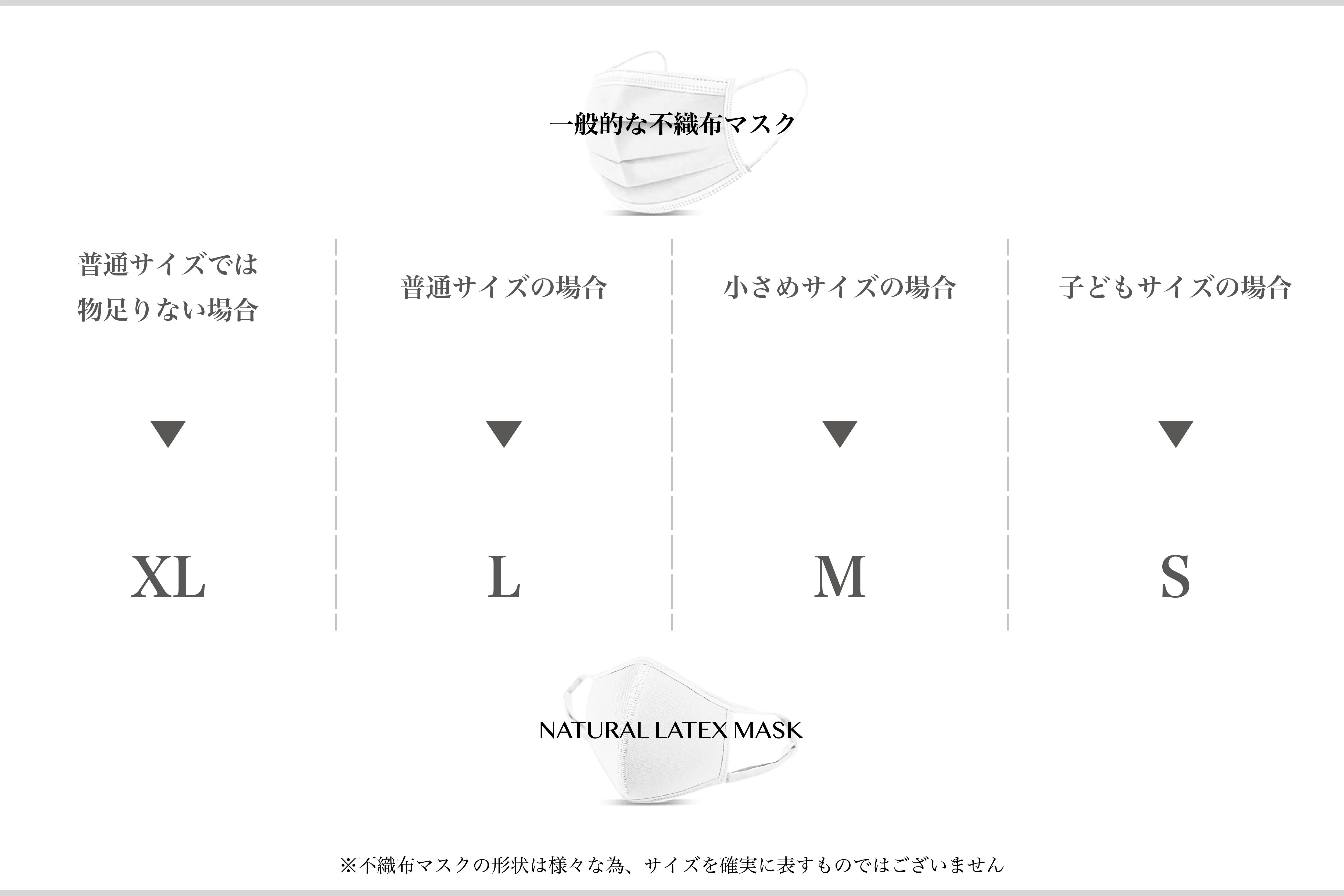 ■ラテックスはゴム製品ですので、かゆみ、発赤、蕁麻疹、むくみ、発熱、呼吸困難、血圧低下、喘息様症状、ショック等のアレルギー性症状をまれに起こすことがあります。※このような症状を起こした場合には直ちに使用を中止し、医師に相談してください。■ラテックス特有の臭いがする場合がございます。(においで気分が悪くなった場合には、使用を中止してください)■ゴム製品のため、使用頻度や保管状況によって劣化する可能性がございます。■染色をしている商品のため、使用前にまれに水洗いで濁る場合がございますが、製品に問題はございません。■マスク上部にノーズワイヤーがついていますので、取り扱いにご注意ください。■洗濯は可能ですが、ノーズワイヤーが折れたり、穴などの亀裂や変形などの不具合がある場合は使用しないで早めの交換をお願い致します。■本品は有害な粉塵やガス等が発生する場所でのご使用はできません。■火気のそばでの使用はおやめください。■製品の仕様、デザイン、および本書の内容は予告なしに変更する場合がございます。※生産時期により生地や耳ヒモの仕様、色味(濃淡)が異なる場合もございます。■梱包の際にマスクの生地にシワができる場合もございます。(水洗いなどで直ります)■マスクは感染(侵入)を完全に防ぐものではありません。