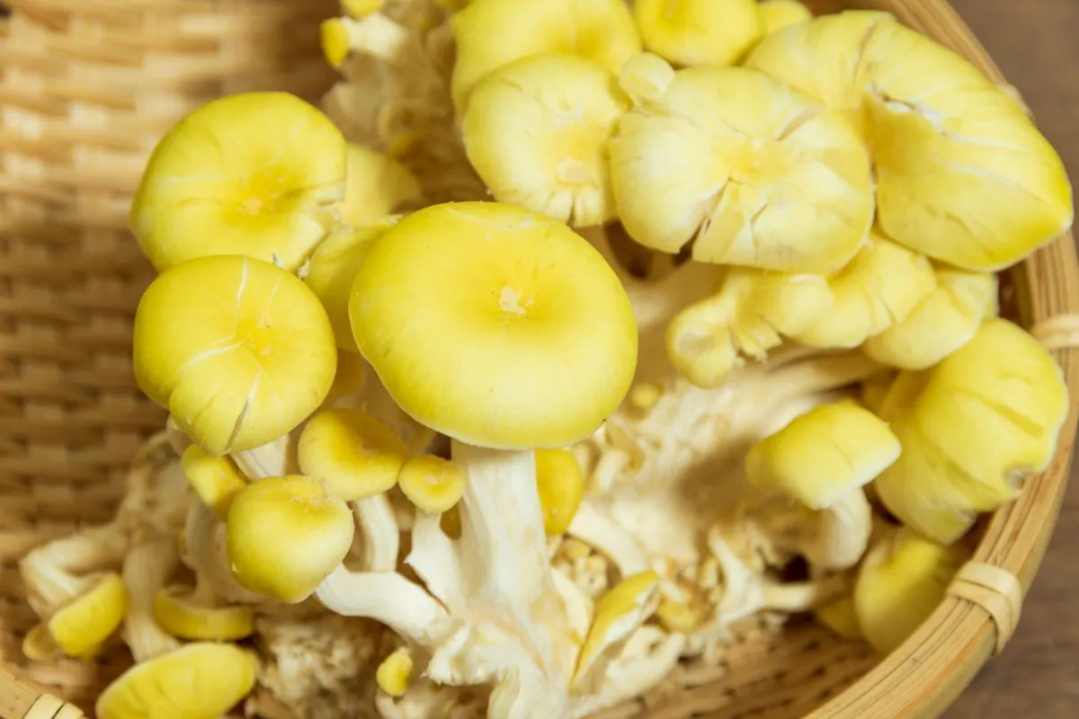 鮮やかな黄金色の傘が特徴のヒラタケ科のキノコ(英名:ゴールデンオイスターマッシュルーム)です。