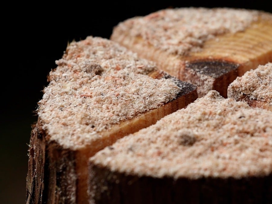 間伐材をトーチとして再利用する利点としては、切った幹を薪のように割り、時間をかけて乾燥しなくても短期間で使用できるので手間がかからずリサイクルが可能な点です。