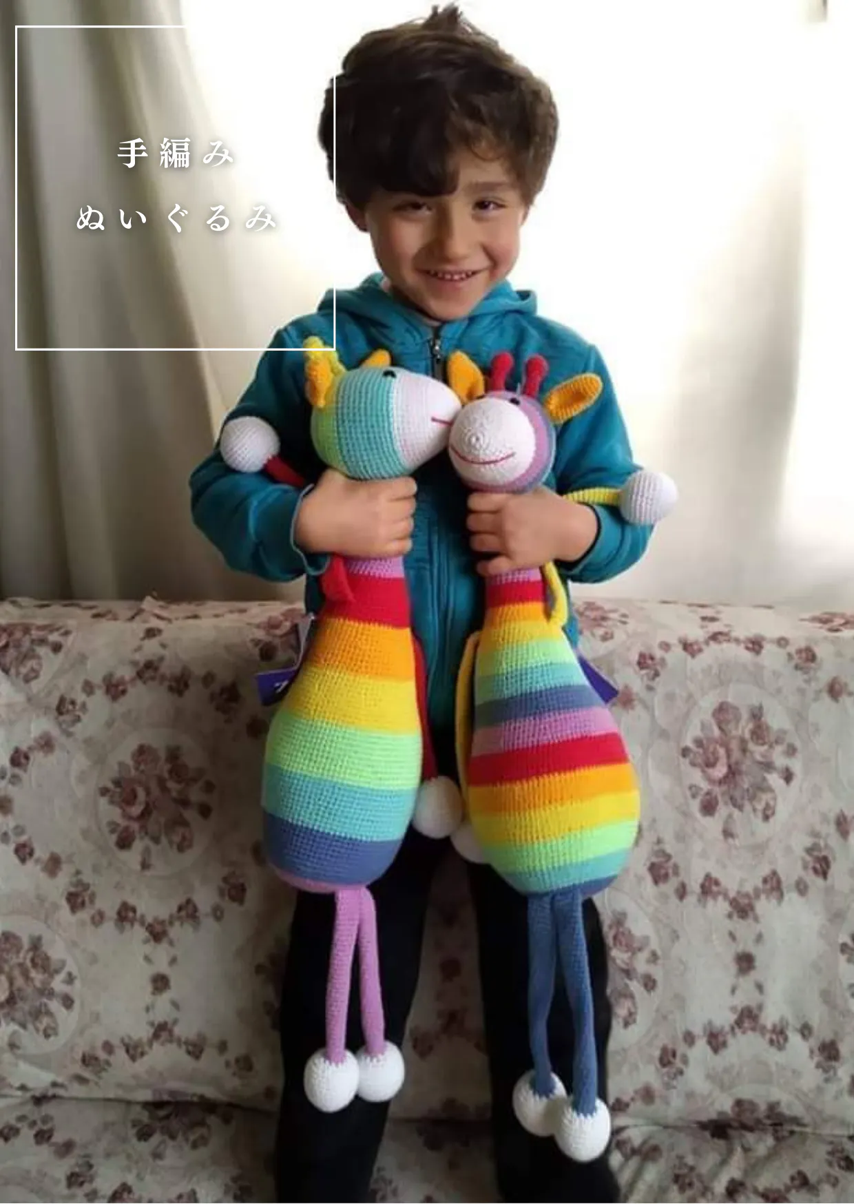 ・キリンのぬいぐるみは、お母さんとそのお子さんが大好きな動物で、皆さんに届けたいという想いがあり制作しているそうです。商品サイズ 40cm ・素材 毛糸 ・デザイン レインボーカラー