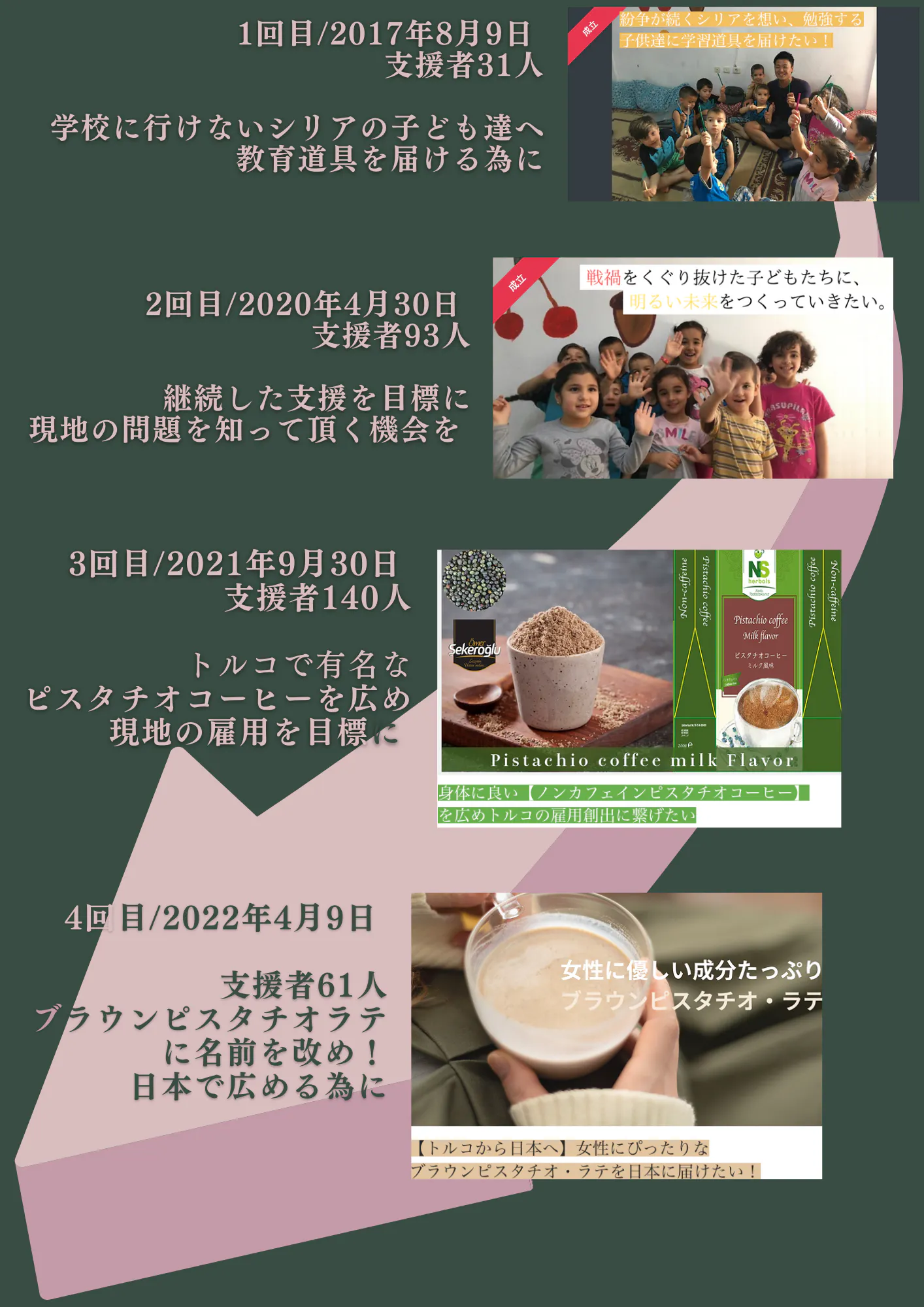 このプロジェクトは、ブラウン・ピスタチオラテの販売だけでなく、トルコ人とシリア難民を繋ぎ、また現地の人たちの幸せの循環によって、未来を生きる子ども達の偏見を無くす事を最終的な目標にしています。