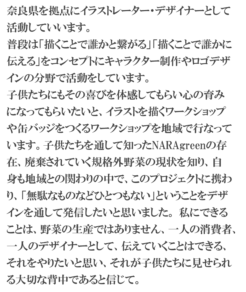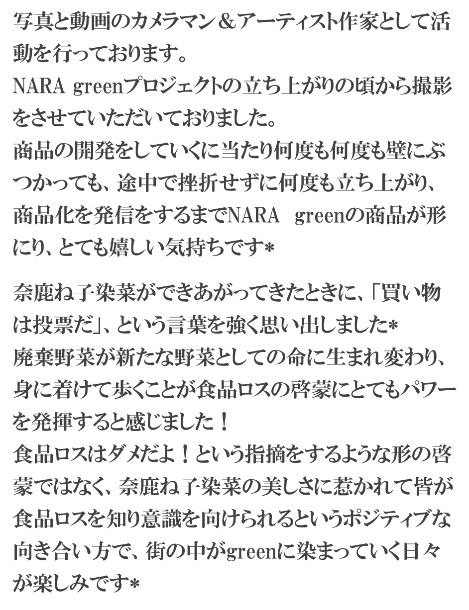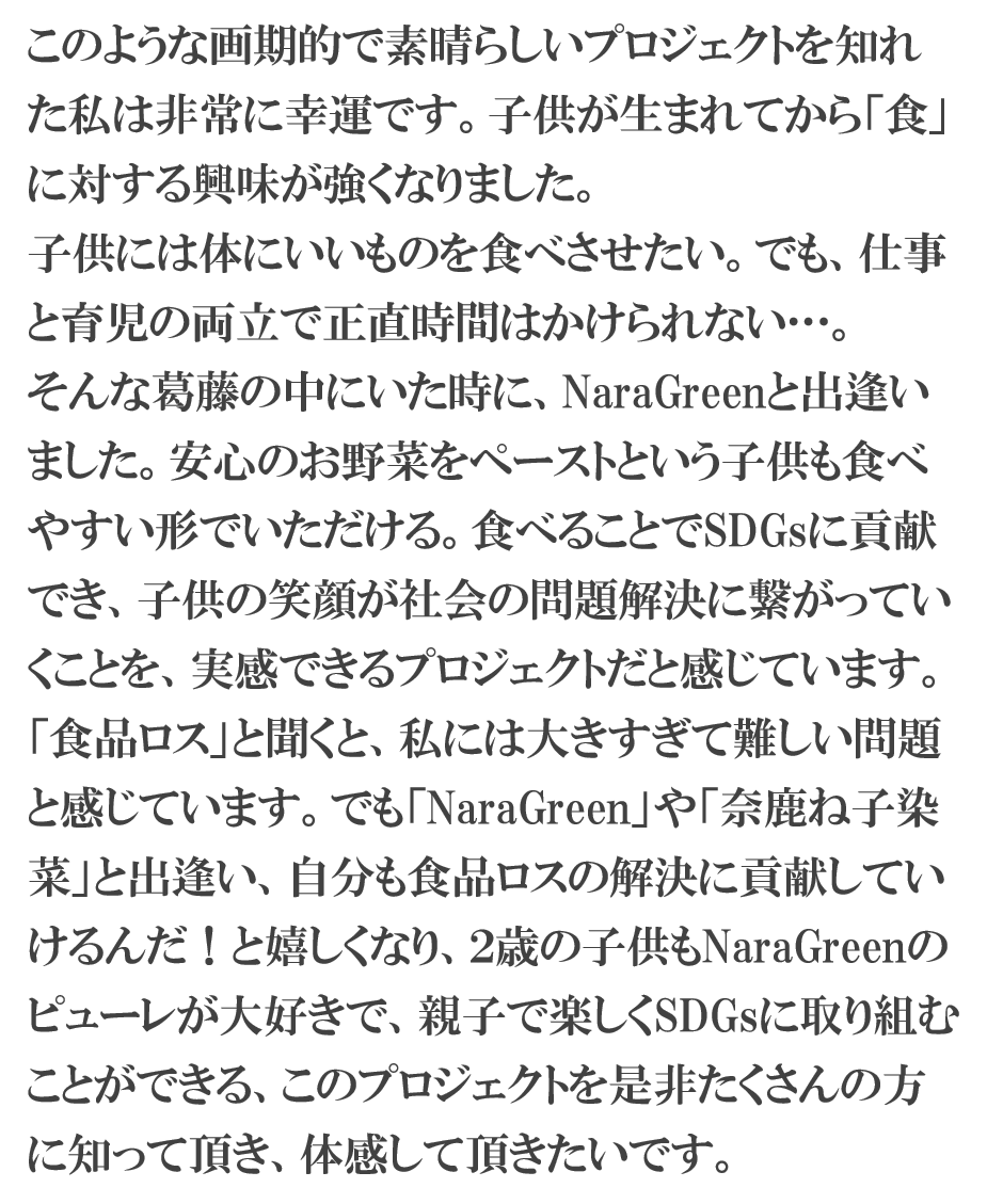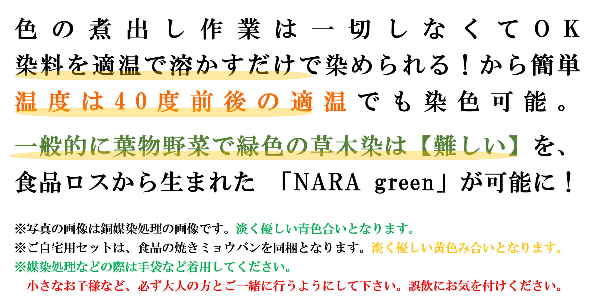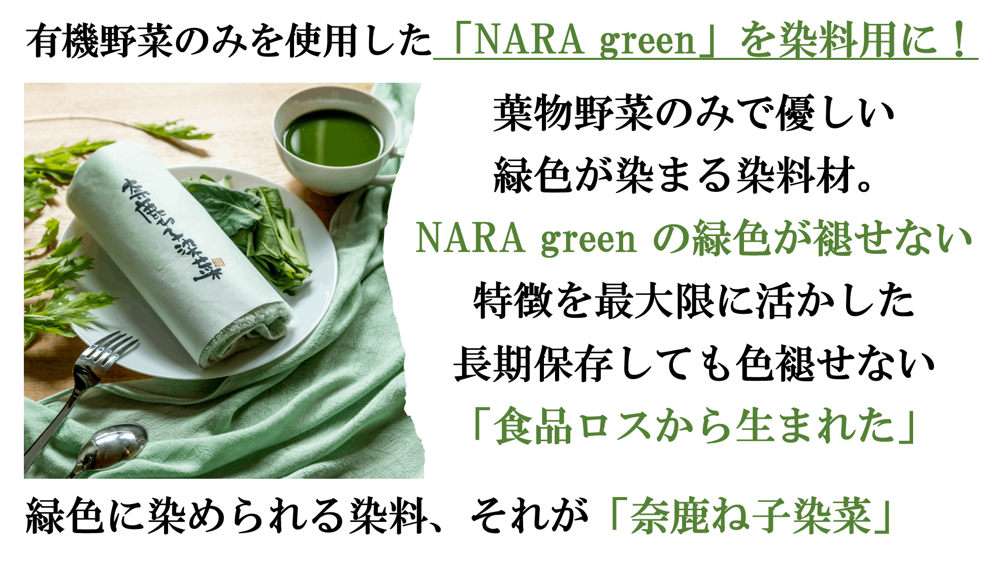 そんな安心安全なNARAgreenの特徴を最大限に活かした、葉物野菜で緑色染料を実現し【社会課題を楽しいに変える】未来を実現したい。