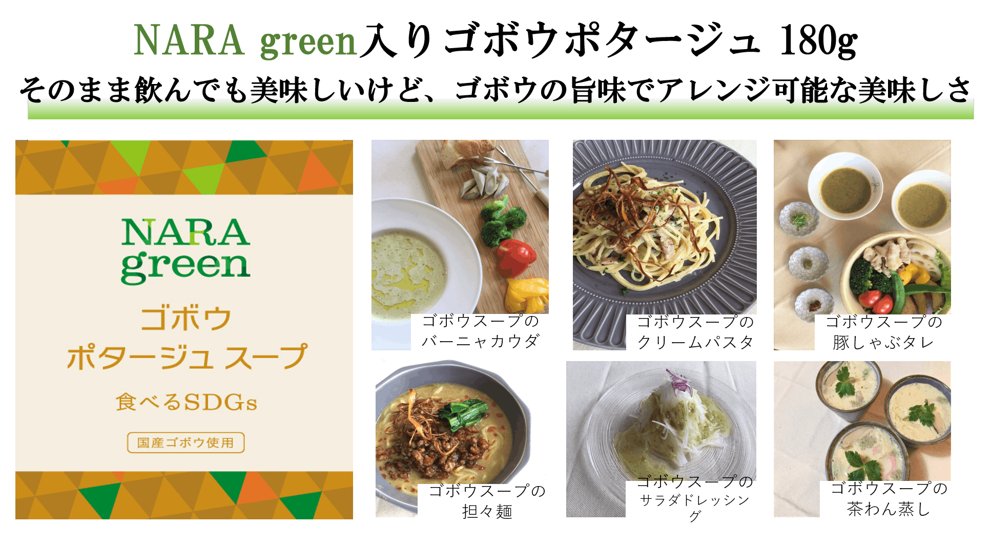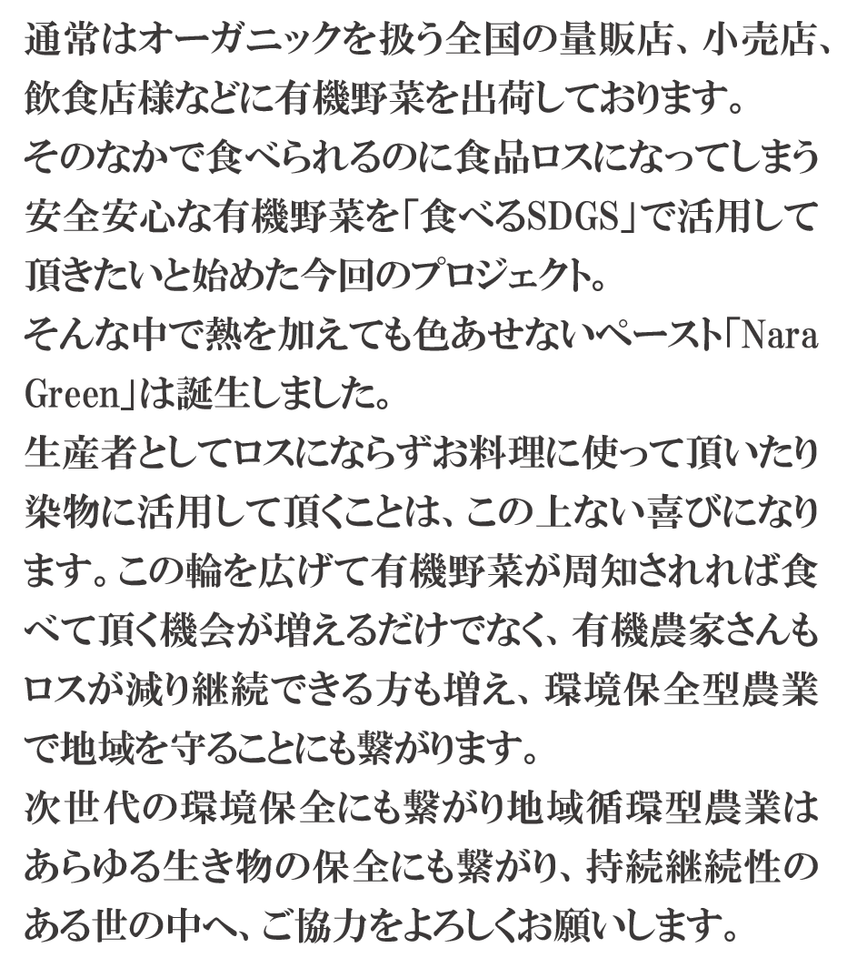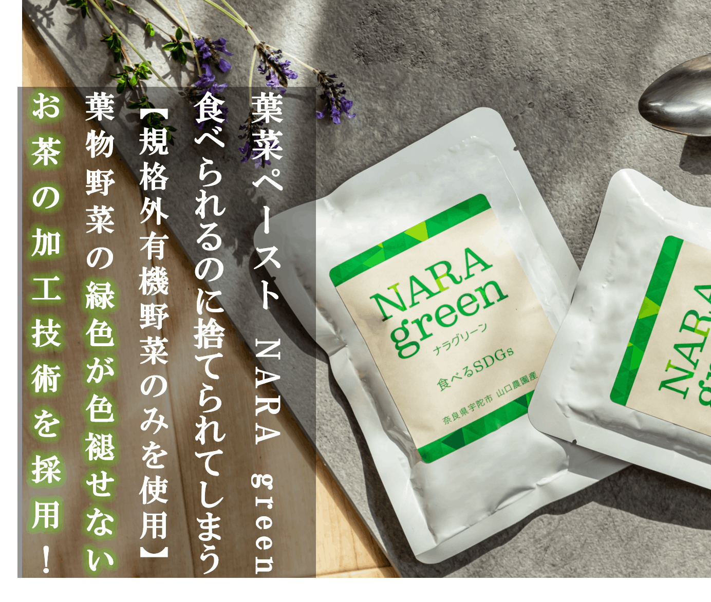山口農園で育てられた有機野菜のみを使用し、環境に配慮した葉物野菜と、国内の食品ロス問題と 向き合い、“食べるSDGs”として“食品ロス野菜”を 社会資源へと有効活用するために生まれたのが、葉菜ペースト「NARAGreen」