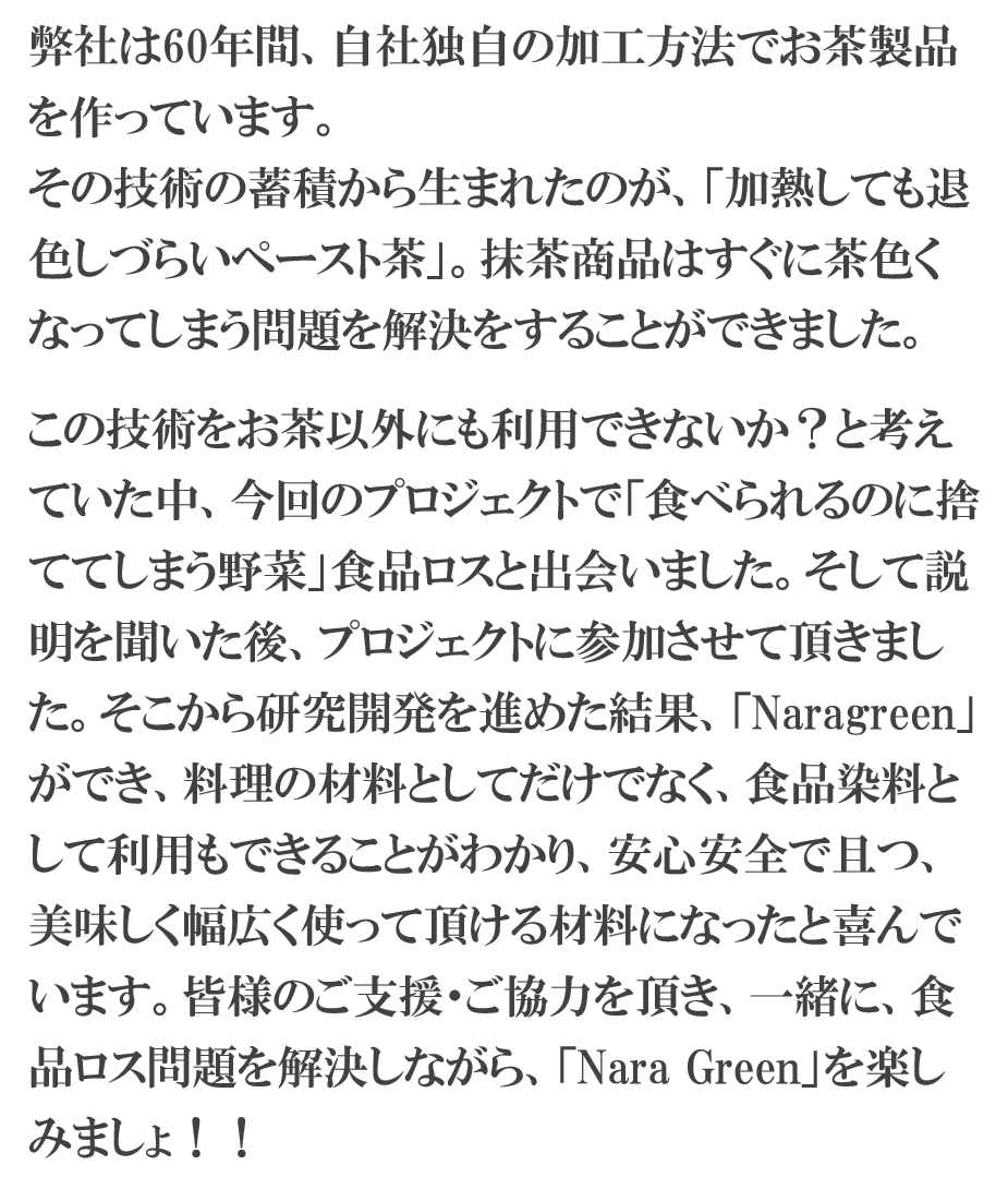 有機野菜のみを原材料にお茶の加工技術で色褪せない、規格外「有機野菜から生まれた、食べるSDGs NARA green」です。