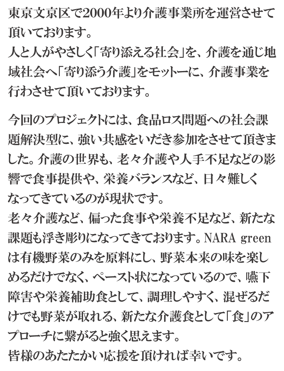2022/11/17 09:16本日がついに最終日となりました。本当に沢山の方にご支援を頂けました事を、感謝申し上げます。山口農園さん、日本緑茶(加工)さんと一緒に1年の歳月を掛けて、失敗を繰り返しながらも諦めずに前に進めた結果、多くの方のご支援を頂ける結果に結びつきました事を、再度心より感謝致します。最終日となりましたが、ネクストゴールに少しでも近づける様に、皆様の最後のご声援を頂けると幸いです。最後まで何卒、宜しくお願い致します。返礼品(商品)の加工、製造依頼など8割ほど終了しております。タオルなどの最終校正チェックなどで完了する所まで進めさせて頂いております。※小冊子などの校正は別途にて、もう少し掛かる見込みでございます。皆様のご声援を頂き、奈良県の社会福祉協議会より一般社団法人Esの地域社会連携活動が認められ、次号掲載へのインタビューを受けさせて頂きました。また、奈良県にございます女子大とNARAgreenを使用したコラボレシピ開発もスタートさせて頂きました。沢山の方に【食品ロス問題】への取組に共感して頂き、子ども食堂支援や地域社会連携など、これからも一般社団法人Esは、持続可能な社会を目指して活動の歩みを進めさせて頂きます。最終日に長文となり誠に恐縮ではございますが、ご報告をさせて頂きます。 もっと見る