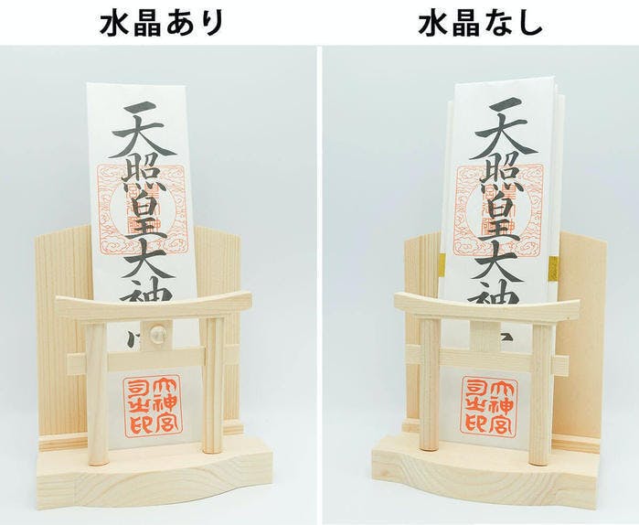 特製鳥居は、水晶がないシンプルタイプと浄化と開運に通じる本水晶を配した水晶鳥居タイプの2種類をご用意。ご予算に応じてお選び頂けます。