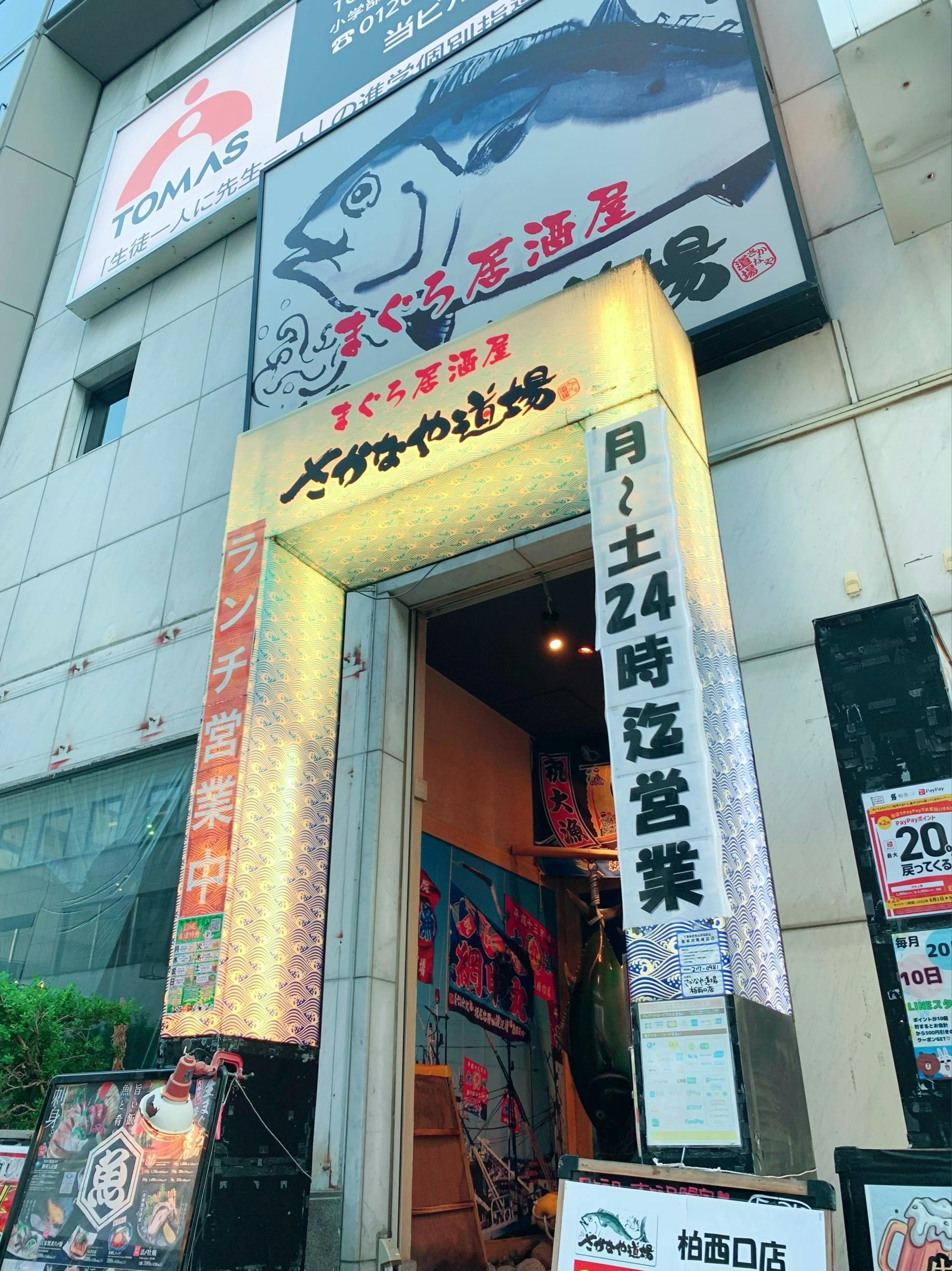 千葉県の常磐線柏駅を西口へ降り、徒歩で1分ほどで到着する大きなマグロの看板とマグロのオブジェが目印の居酒屋チェーン店です。