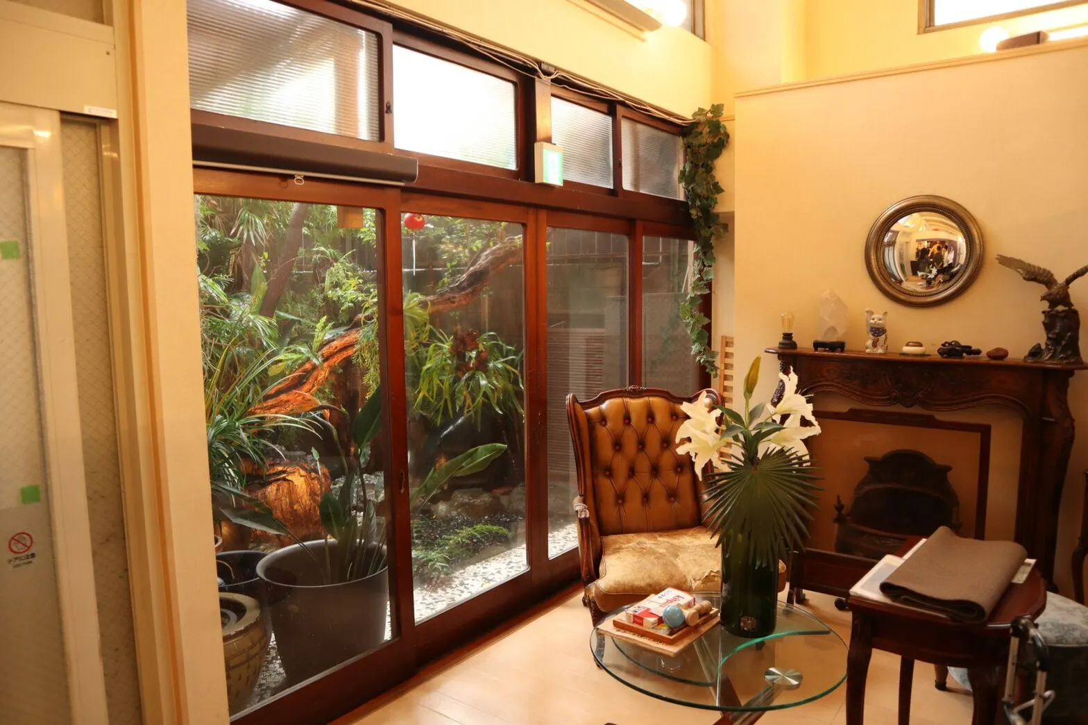 フロント前の待合室にはアンティーク家具がそろっており、中庭を眺めてアジアンリゾート気分を味わえます。