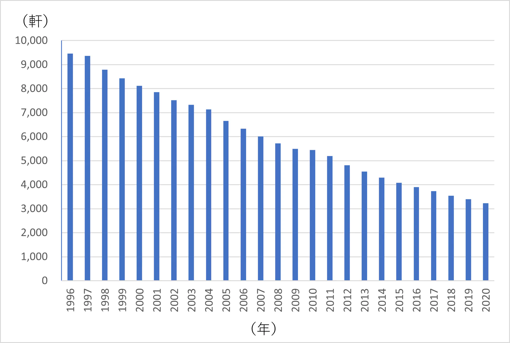 下のグラフの通り、全国的に見ると、銭湯はピーク時の1996年9461軒から、2020年には3231軒に減っています。東京都においても2011年の766軒から、2021年には480軒に減少しています。