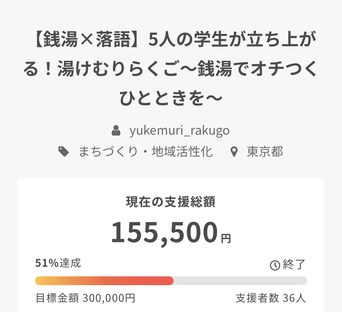 2022/11/08 11:391ヶ月程にわたるクラウドファンディングが終了致しました…!ご支援・応援して下さった皆様本当にありがとうございます!!全員にとってはじめての「銭湯×落語」イベントの計画・クラウドファンディングであり、試行錯誤し続ける1ヶ月間となりました。そのような中、拡散してくださったり、DMを下さったり、皆様のお気持ちがとても励みになりました⸜❤︎⸝イベント当日まで残り1週間を切りましたが、皆さまから頂いたエールを力に、最後まで走り抜けたいと思います!応援よろしくお願いいたします! もっと見る【重要なお知らせ】ステファニー・コロインさんの出演キャンセルに関しまして