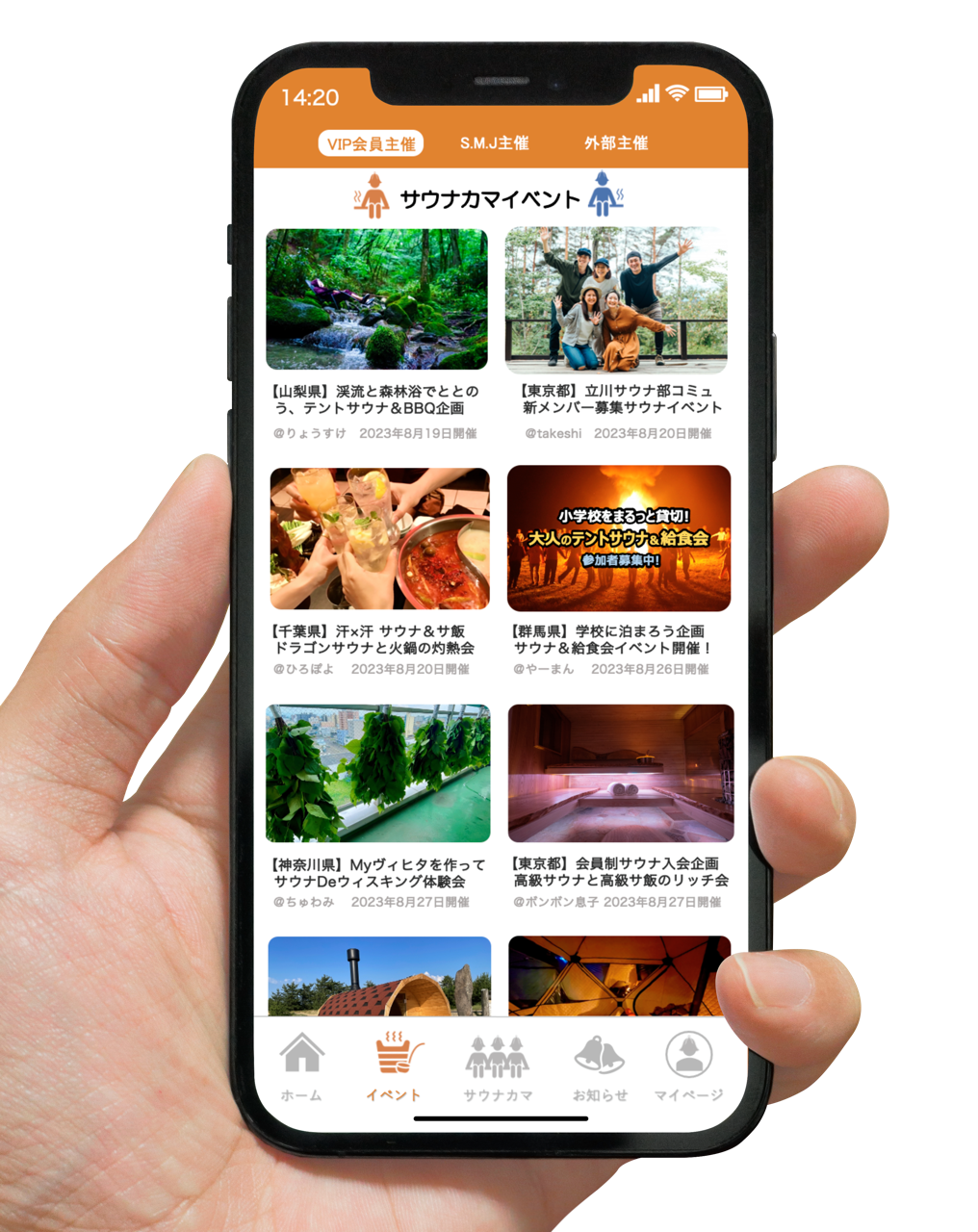 サウナカマイベントページでは、S.M.JAPAN運営主催と一般に周知されている外部主催のほか、サウナカマVIP会員はご自身が主催者となってイベントを立ち上げることが可能となり、イベントページにて告知することもできます。