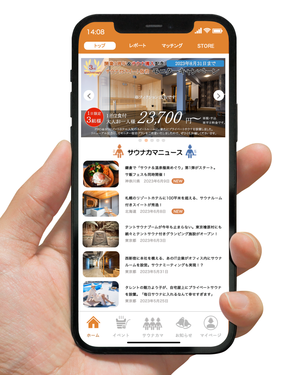 サウナカマアプリのTOPページでは、サウナに関連する最新ニュースや、注目のサウナ施設、注目のサ飯、注目のサウナ付き宿泊施設なども紹介していきます。