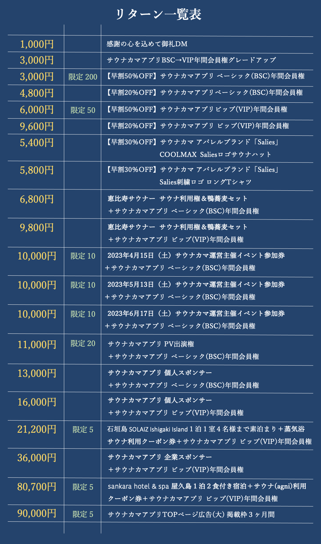 今回のクラウドファンディングで集まった資金は、CAMPFIRE手数料を除き、サウナカマアプリの開発費用の一部、商品仕入れ、販促、支援者の皆様へのリターン配送の費用として大切に使用させていただきます。