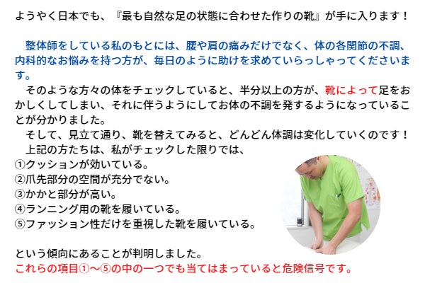 我々日本人も、ほとんどは、子供の頃、裸足で歩いたり走ったりしていました(しかも、土のグラウンドで。少し大きな石を踏むと痛かった経験が懐かしいです。)。靴を履かずに飛び跳ねたり走り回ったりしても、何の問題もありませんでした。私たちの足は本来、丈夫で健康だったのです。