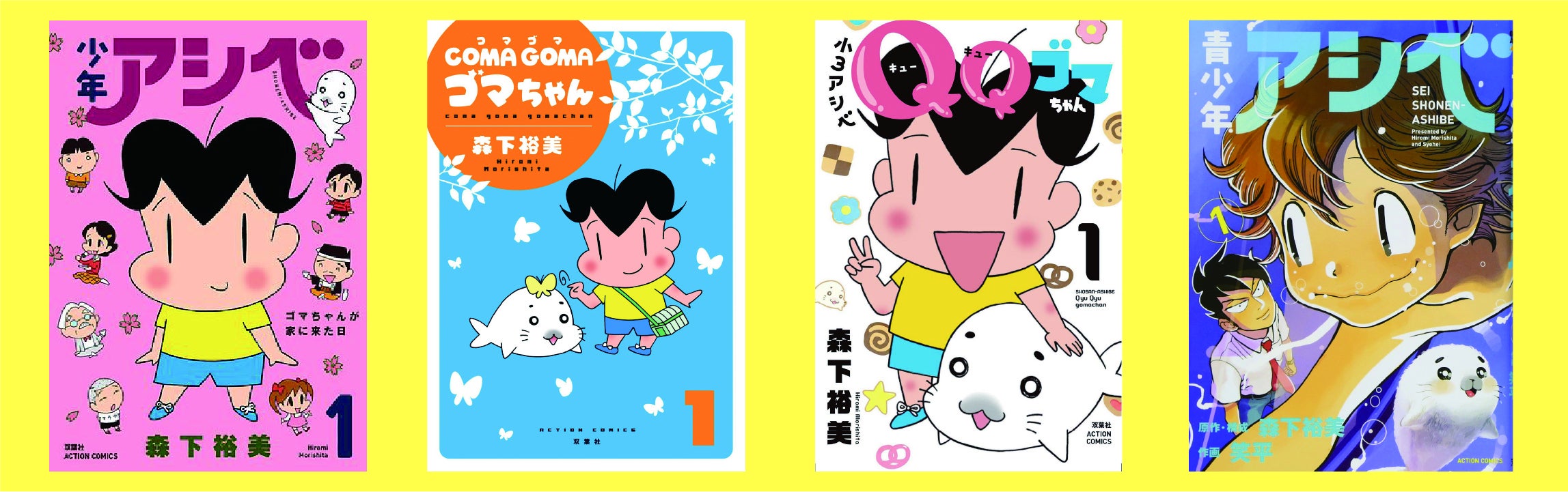 ゴマちゃんは漫画『少年アシベ』で1988年にデビューしました。『少年アシベ』はアニメ化され、「キュ〜」と鳴く白いアザラシのゴマちゃんは一大ブームを巻き起こし、ぬいぐるみはコピー商品が出回るほどの大人気に。『少年アシベ』連載終了後もアシベが小学2年生になった『COMAGOMA』(コマゴマ)が連載。