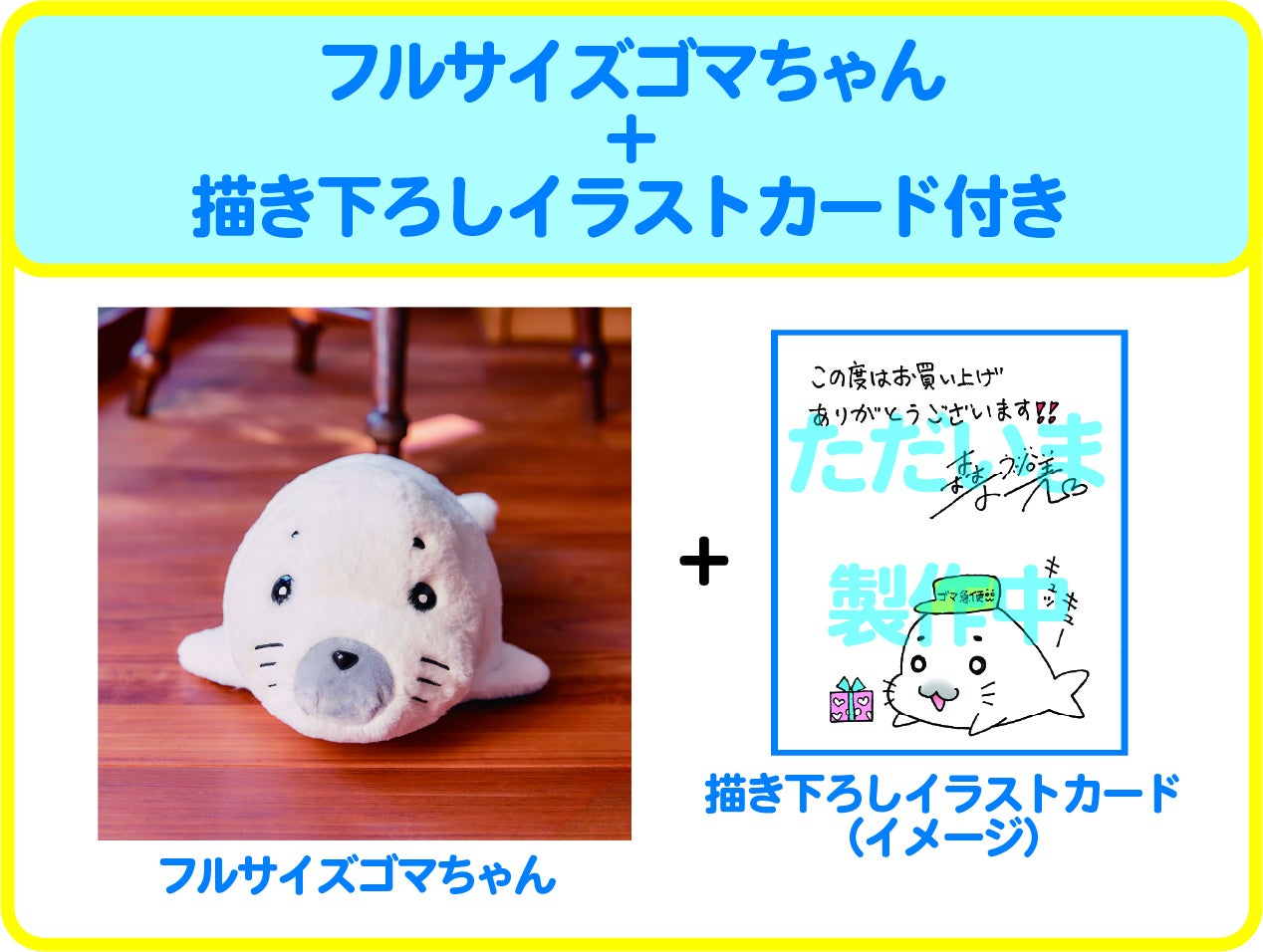 全長約35cmのおでかけにぴったりのゴマちゃんハーフサイズと、クラファン限定描き下ろしイラストカード付きのプラン。