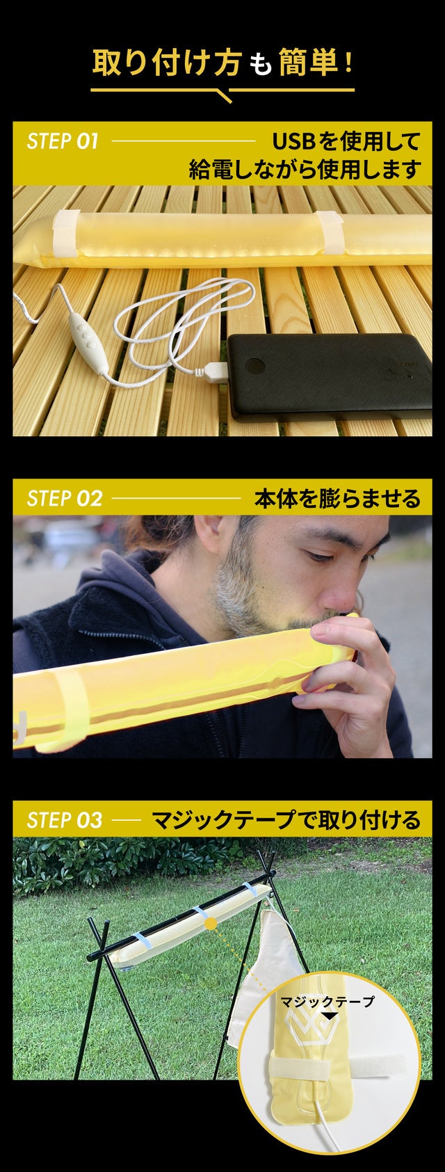 PVCのカバーを通して淡く光る暖色のLEDはまるで本物の炎に近い発色をしているので、エアーチューブライト1つでサイトの雰囲気がグッとオシャレになること間違いありません!