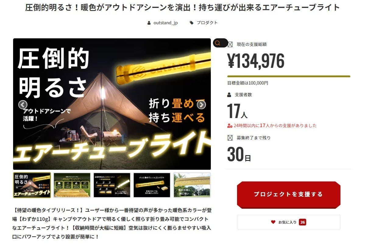 2022/11/10 19:04【公開開始『10分』目標金額の10万円が達成されました!】初めまして。outstandの渡邊と申します。この度は『圧倒的明るさ!暖色がアウトドアシーンを演出!持ち運びが出来るエアーチューブライト』のプロジェクトをに興味を持って頂き、ありがとうございます。皆様のお陰で公開開始僅か『10分』で目標金額の10万円が達成されました!ご支援頂いた皆様、誠にありがとうございます。よろしければSNSのシェアでも応援して頂けますと幸いです。『エアーチューブライト』のプロジェクトは明るくコンパクトで便利なライトを皆様に様々な場面でご使用頂きたいという強い思いからプロジェクトがスタートしました!キャンプ、アウトドアはもちろん。車中泊、登山、いざというときの防災ライトとしても使える便利アイテムです!プロジェクトページで使用されている写真のほとんどは、私自身がキャンプ場で実際に使用し撮影して来たものを使用させて頂きました。皆様もこのエアーチューブライトの明るさを是非体感してみてください!商品の発送は1月の予定となっておりますが、出来るだけ早くご支援いただきました皆様の元に発送出来るように準備しております!年内のお届けを目標に調整しておりますので、発送の準備が出来次第活動報告から改めてご報告させていただきます。商品の発送まで少しお時間が空いてしまいますが、商品到着まで楽しみにお待ちください。 もっと見る