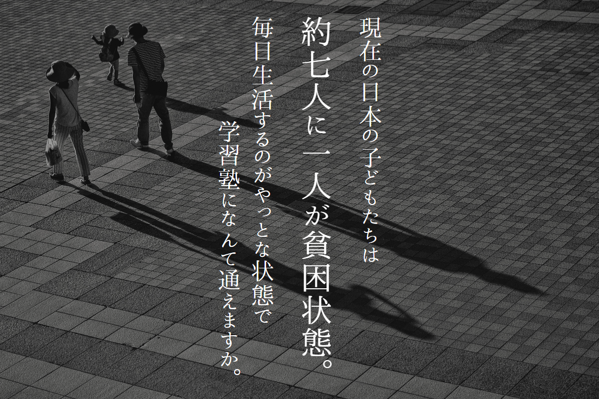 現在、日本では子どもの貧困率がOECD加盟国の中で最悪の水準にあり、7人に1人の子どもが貧困状態※4にあるとされています。そのような状況におかれた子どもは当然のことながら学習塾に通うのが難しいと思われます。問題解決のために生活支援の面では国や行政、NPO法人などが支援にあたっていますが、貧困状態にある子の学習面の支援は十分に行われているのでしょうか。