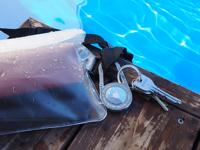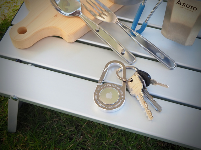 まず、500円玉程度の大きさのAirTagを大切なものに入れたりつけたりします。