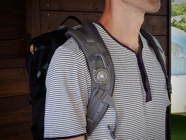 紛失防止機能が搭載されたAirTagをカラビナにセットしたら、あとは大切なものにつけるだけ。