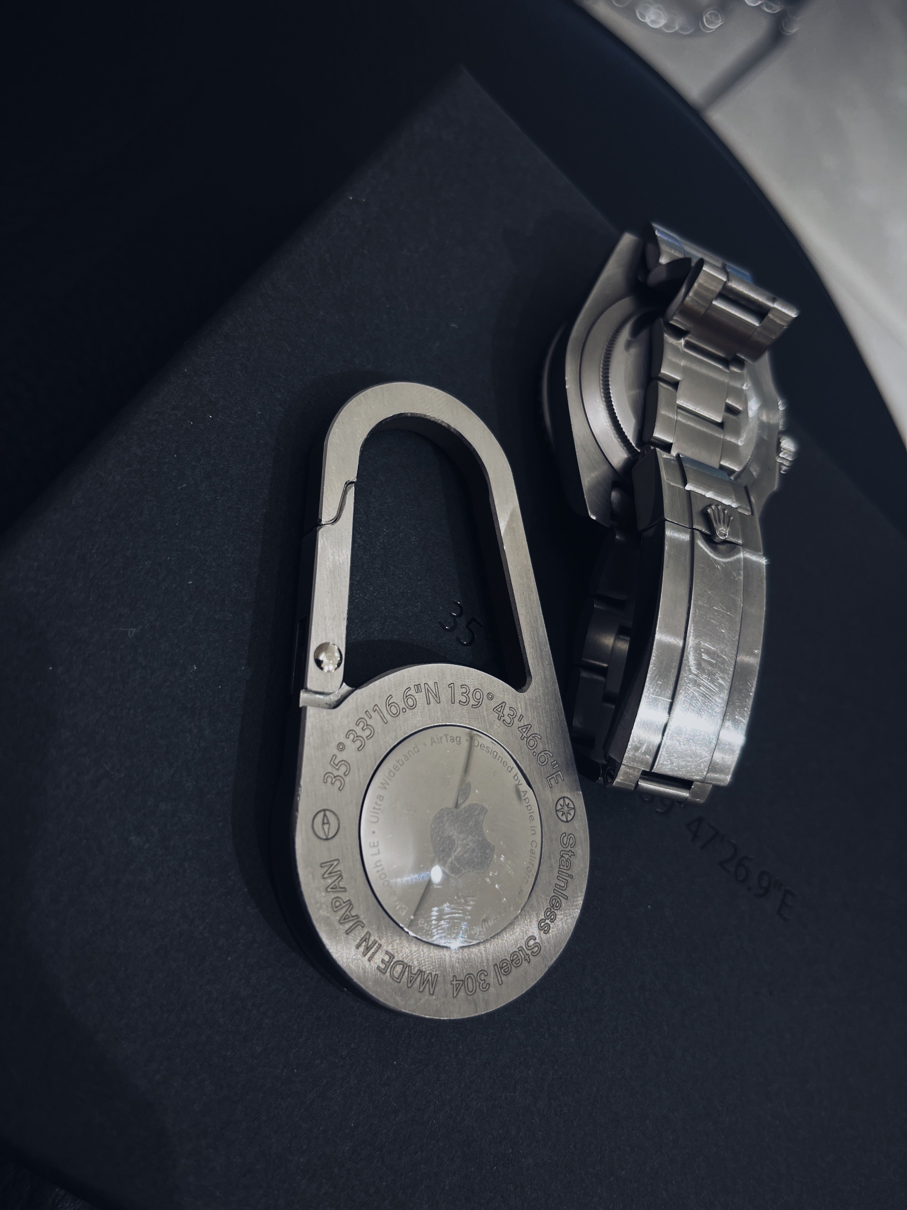3種類の金属の塊から削り出して製作した、Apple社のAirTag専用ケースです。