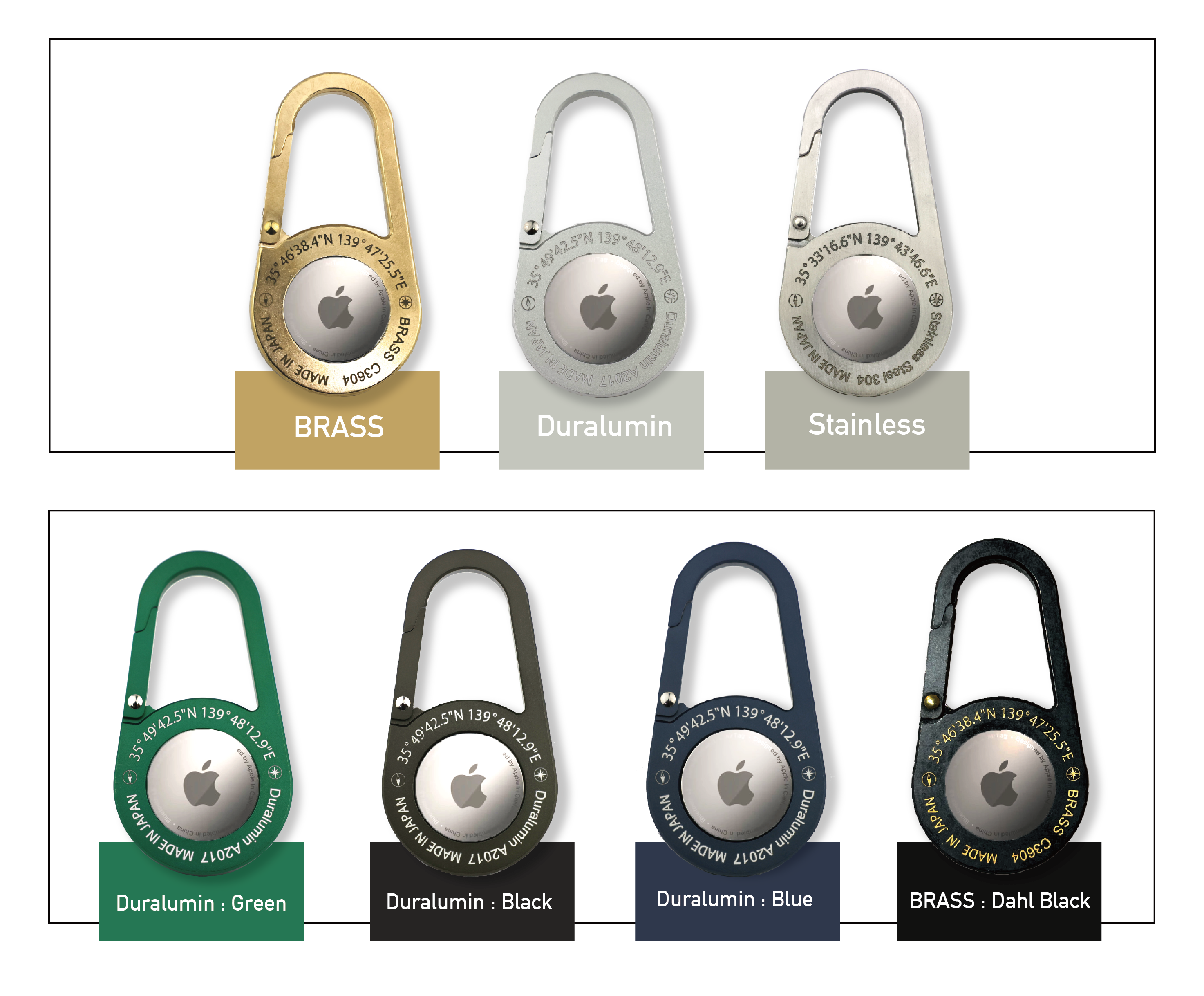 ⑹【素材別3種コンプリートセット!】AirTag専用カラビナ 真鍮、ジュラルミン、ステンレス各1点ずつ