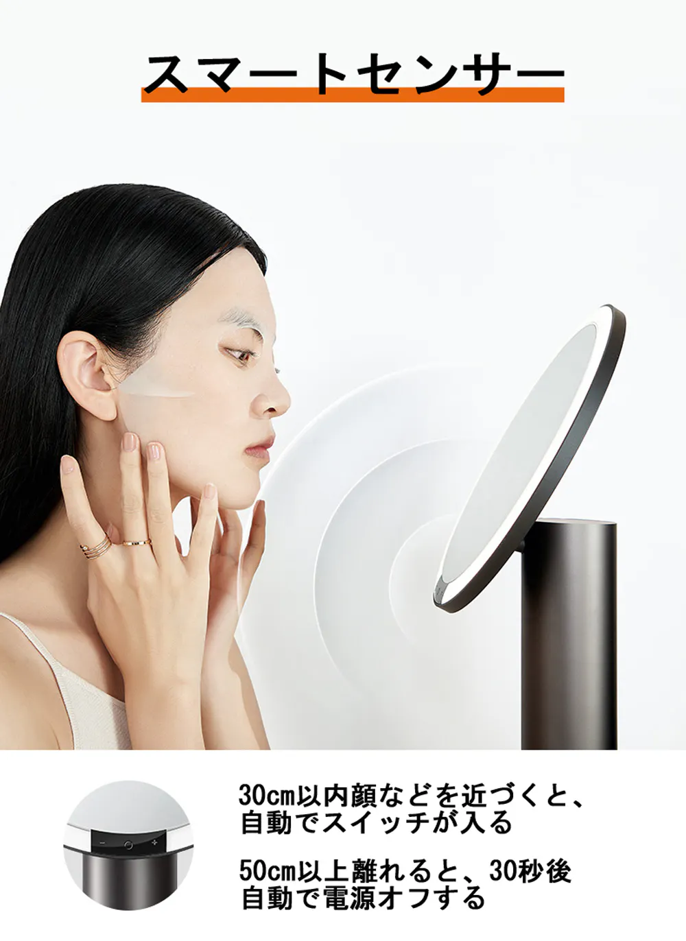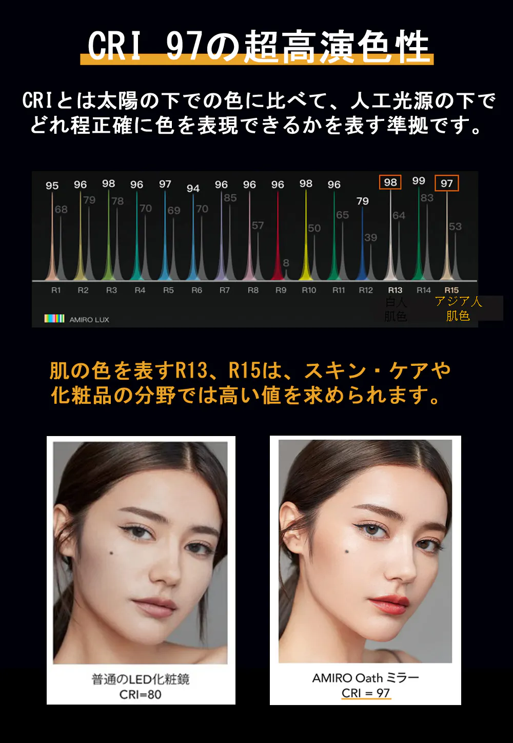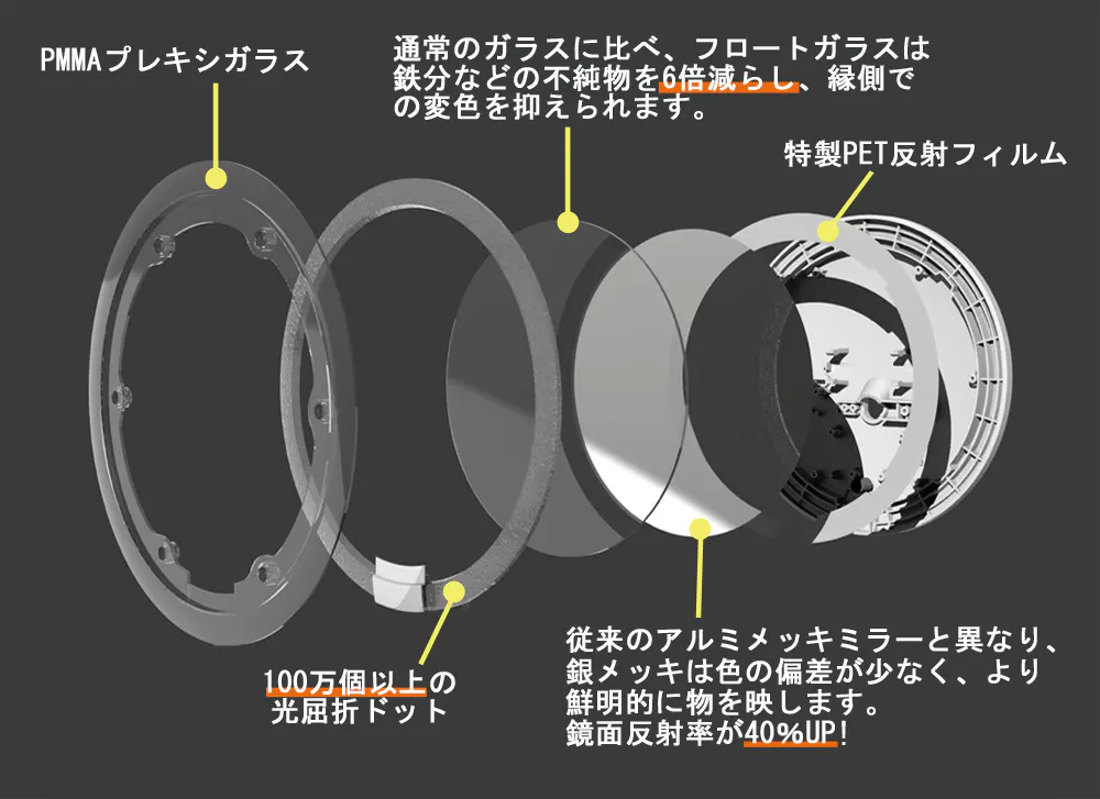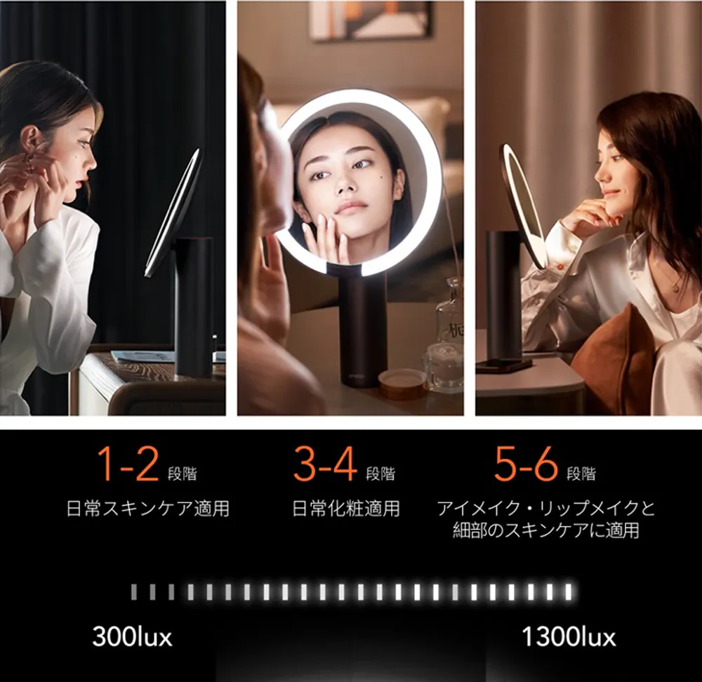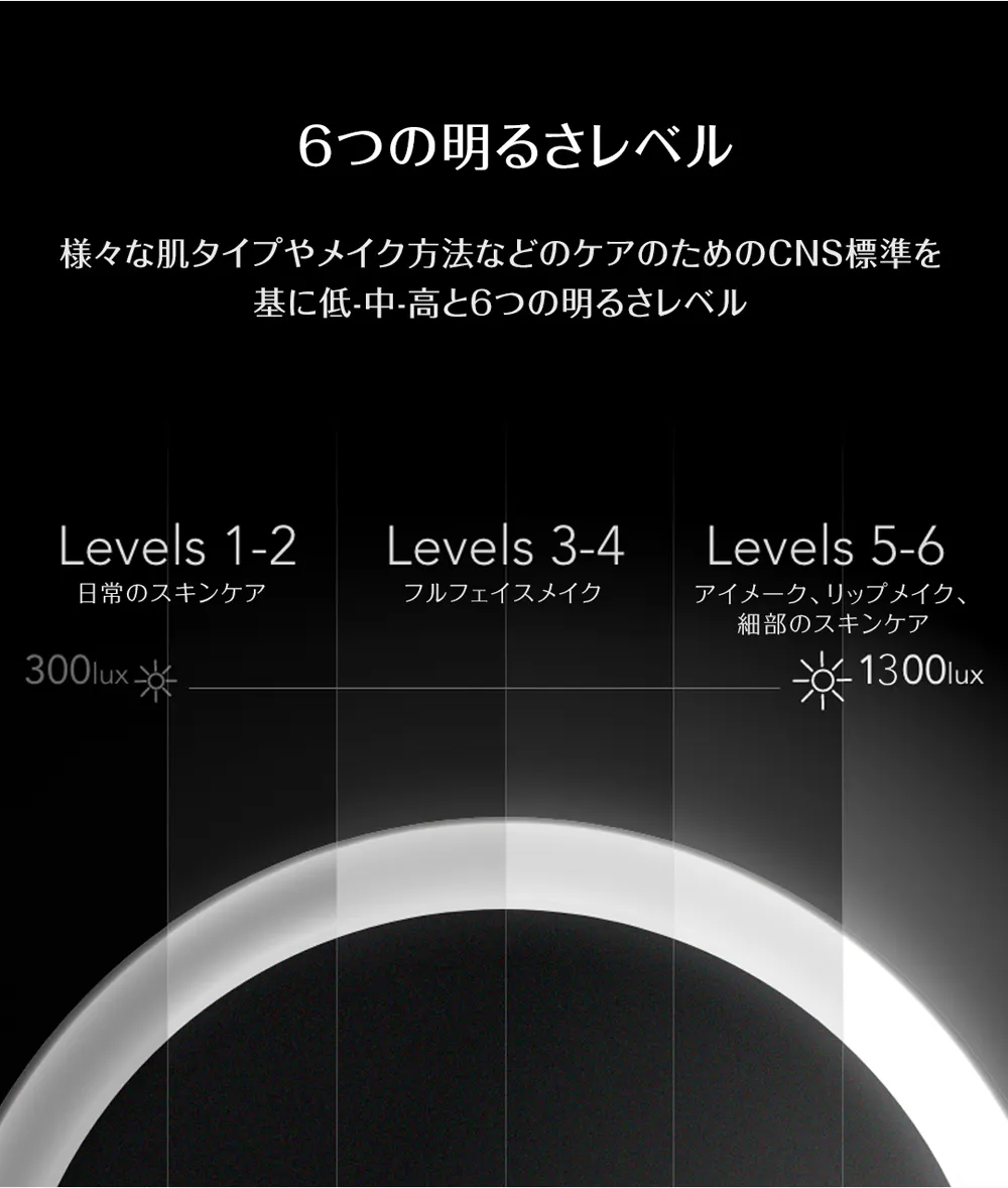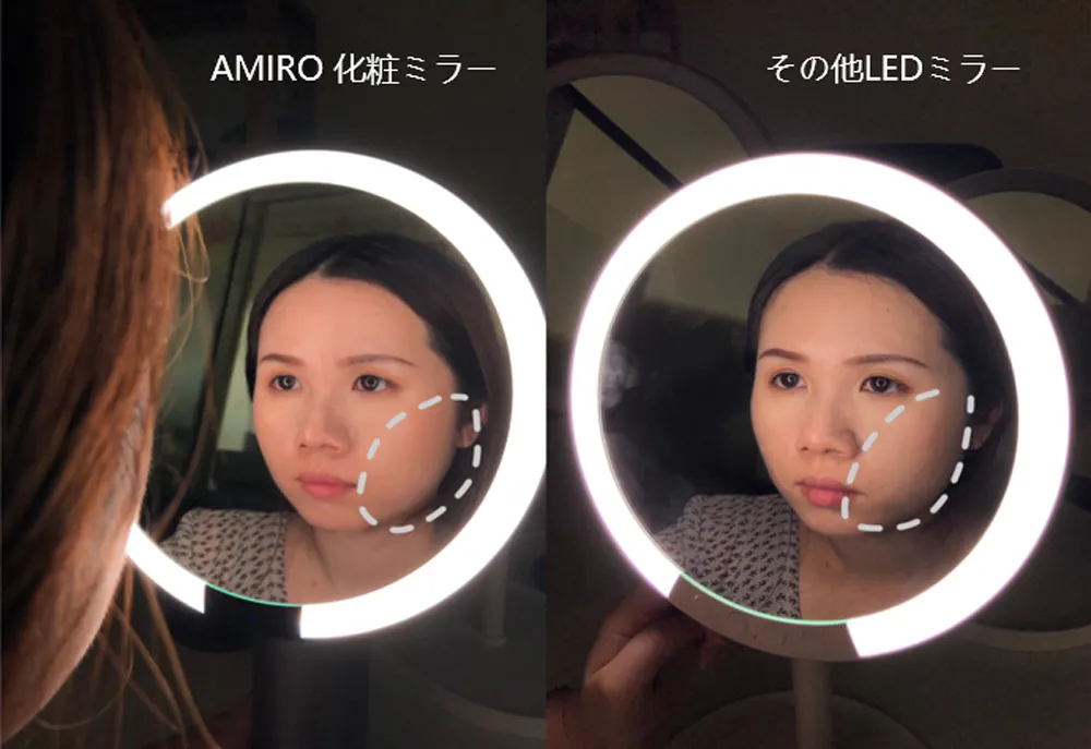 特許取得のPure-Lux光伝導技術によって、100万個以上の光屈折ドットから作られた導光リングで、影なく化粧ムラ防止!「3種類の色温度×明るさ6段階」時間帯やお好みに合わせて、18パータン調整可能!銀メッキ・フロートガラス鏡面を使用し、CRI 97超高演色性。アジア人肌調子や化粧の姿をリアルに伝えられます。